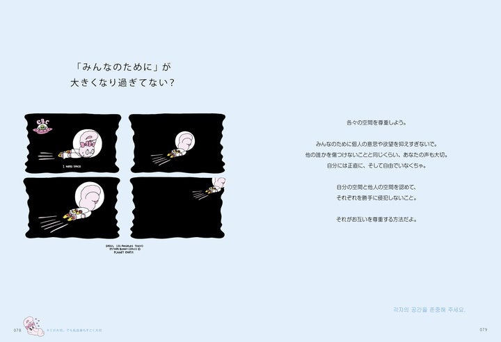 ハングル入りだから、手軽に韓国語学習も韓国発のキャラクターということで、一部ハングルも入れたレイアウトに。日本語のポエムと照らし合わせて読むことで、より理解が深まる仕組みになっています。