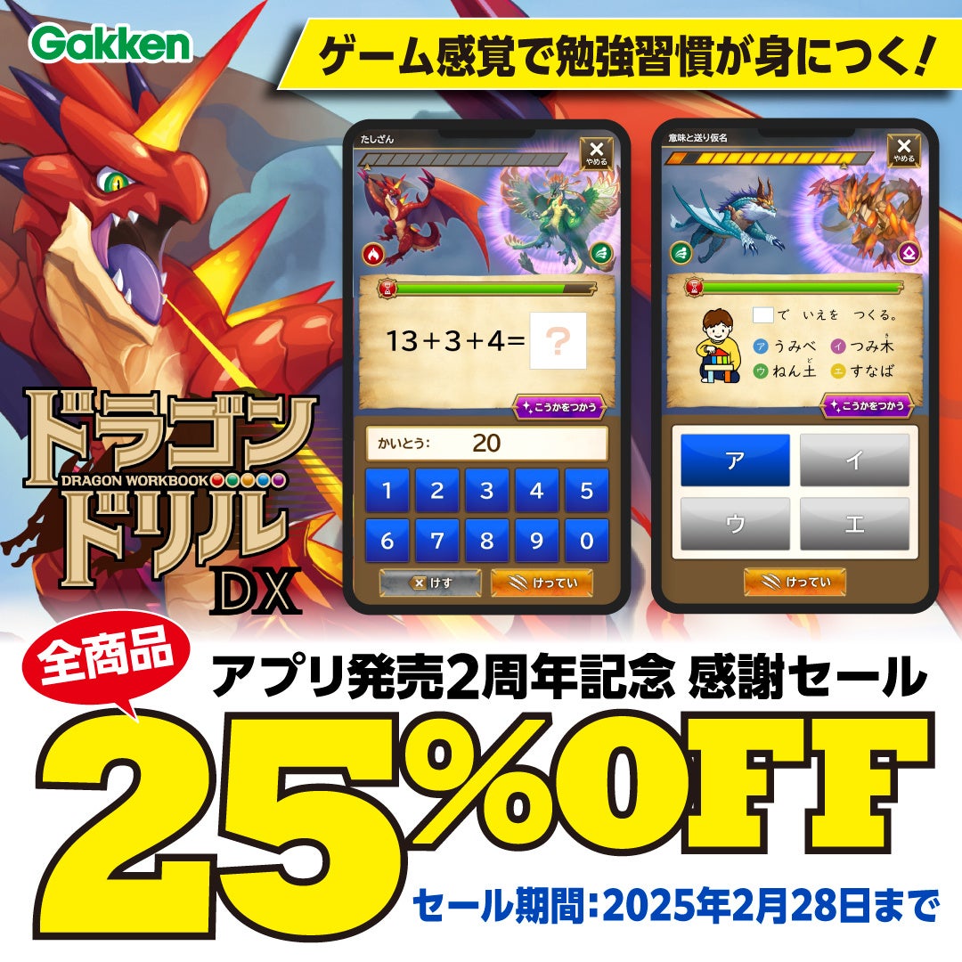 株式会社 学研ホールディングス(東京・品川/代表取締役社長:宮原博昭)のグループ会社、株式会社Gakken(東京・品川/代表取締役社長:南條達也)は、『学研ドラゴンドリル 算数/国語の学習アプリで学ぼう!』iOS/Android版のリリース2周年を記念して、2025年2月14日(金)~2月28日(金)の期間にて、サブスク料金が全商品25%OFFとなる感謝セールを実施中です。