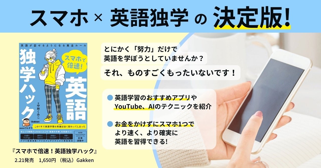 株式会社 学研ホールディングス(東京・品川/代表取締役社長:宮原博昭)のグループ会社、株式会社 Gakken(東京・品川/代表取締役社長:南條達也)は、2025年2月21日(金)に『スマホで倍速!英語独学ハック』(著:中林くみこ)を発売いたしました。