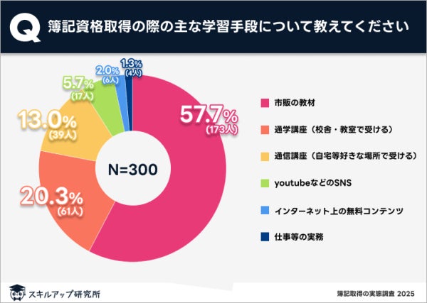 簿記資格取得時の学習方法を調査したところ、「市販の教材を活用した」との回答が57.7%と最も多く、約6割の取得者が独学での学習を選択していることが判明した。