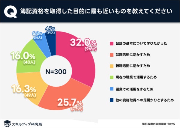 簿記資格の取得目的について調査したところ、「会計の基本知識の習得」が32%で単独では最多となった。しかし、「就職・転職に活かすため」「現在の業務に必要」「副業での活用」といった仕事関連の目的を合わせると60%以上に達した。