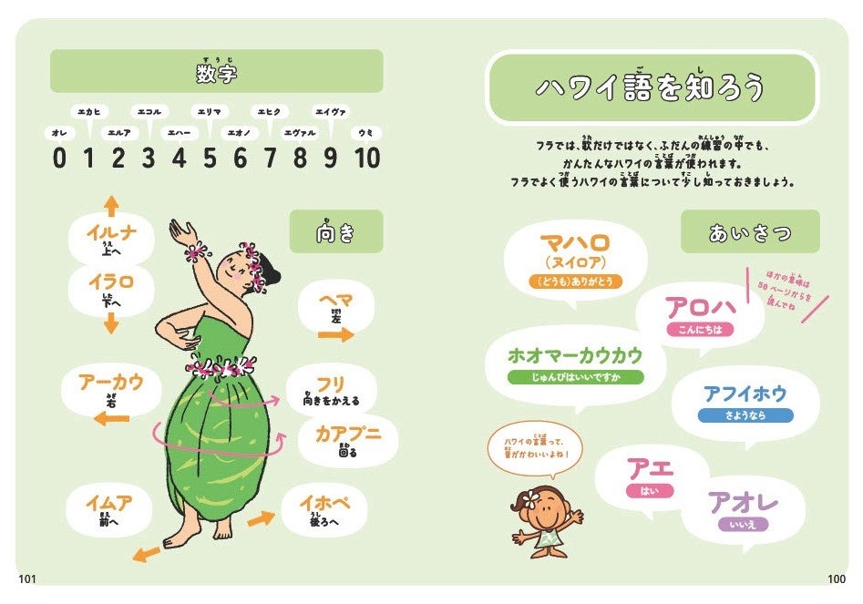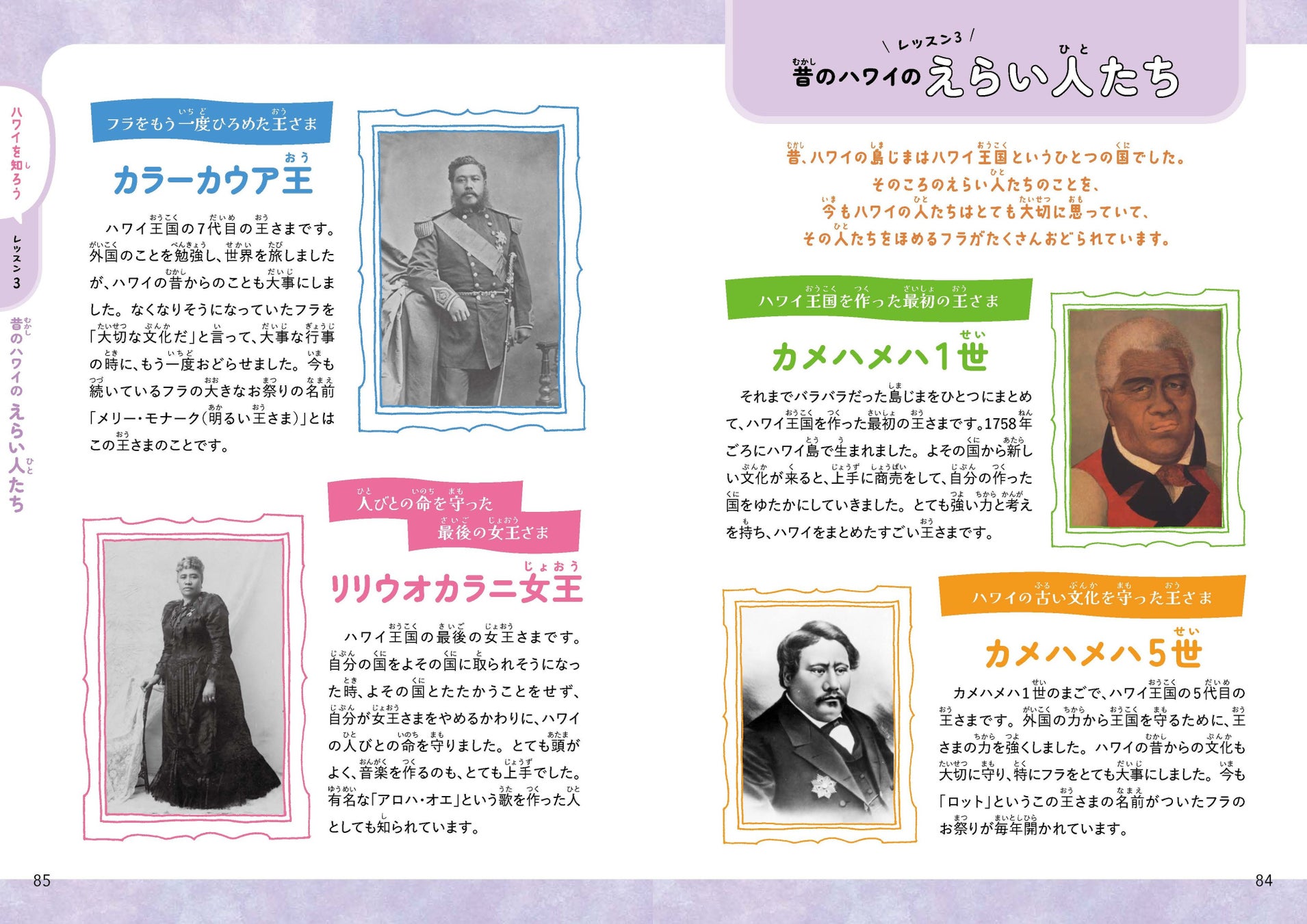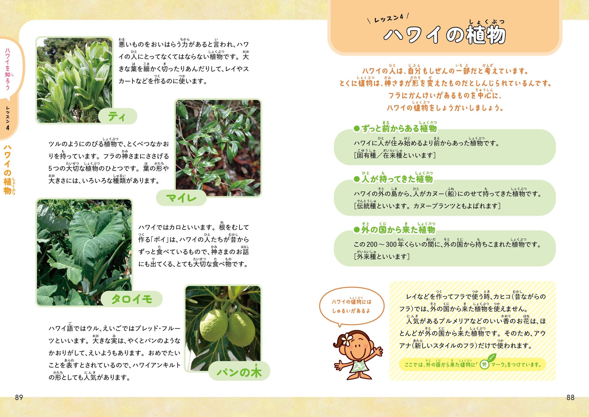 ほとんどのページは、小学校低学年の子どもでも読めるよう、すべての漢字にルビを付けました(一部、大人と一緒に読むページもあります)。フラを習いはじめた小学1年生のリコちゃんが案内役となって、フラとハワイについて知りたいみなさんをご案内します!