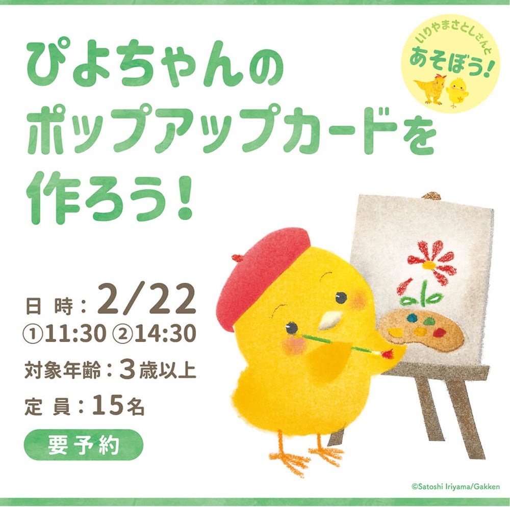 ◆内容:いりやまさとし先生と一緒にポップアップカードづくりのワークショップを楽しみましょう。いりやま先生の「ぴよちゃんえほん」シリーズに登場する主人公ぴよちゃんのポップアップカードを作ります!