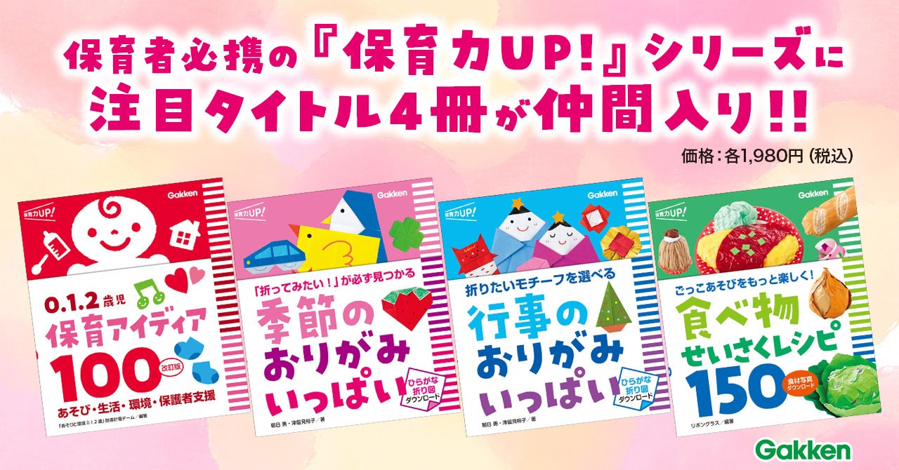 株式会社 学研ホールディングス(東京・品川/代表取締役社長:宮原博昭)のグループ会社、株式会社 Gakken(東京・品川/代表取締役社長:南條達也)は、2025年2月20日(木)に「保育力UP!」シリーズ『0.1.2歳児 保育アイディア100 改訂版』『季節のおりがみ いっぱい』『行事のおりがみ いっぱい』『食べ物せいさくレシピ150』を4冊同時に発売いたしました。