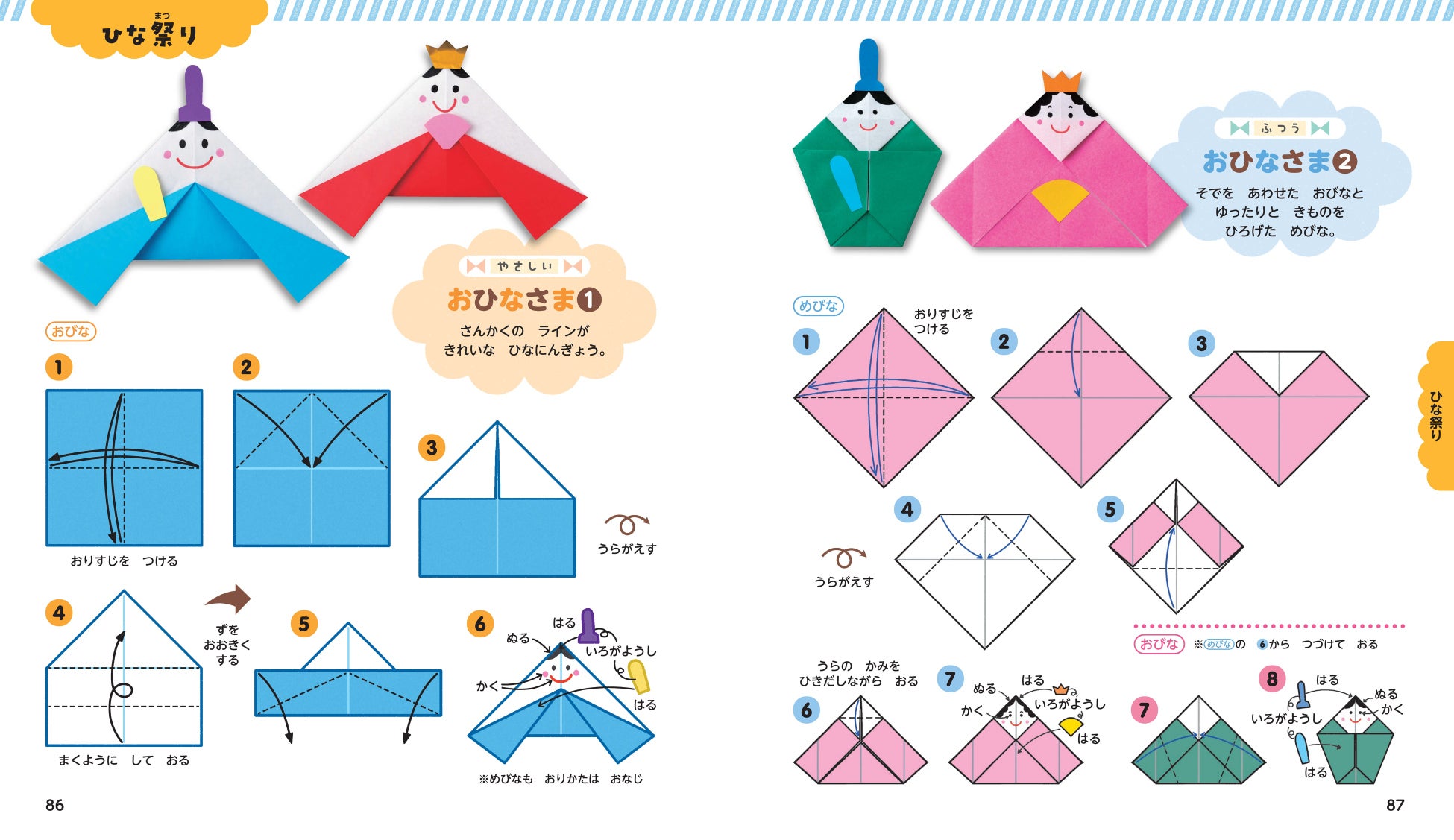 『季節のおりがみ いっぱい』では、春・夏・秋・冬…それぞれ季節の動物、植物、食べ物など、子どもが折りたくなるモチーフのおりがみと、子どもに大人気の乗り物おりがみを全74案。『行事のおりがみ いっぱい』はこどもの日、七夕、クリスマス、節分、ひな祭りなど、季節の行事を楽しみながら、あそびにつながる「行事のおりがみ」を全68点、掲載。