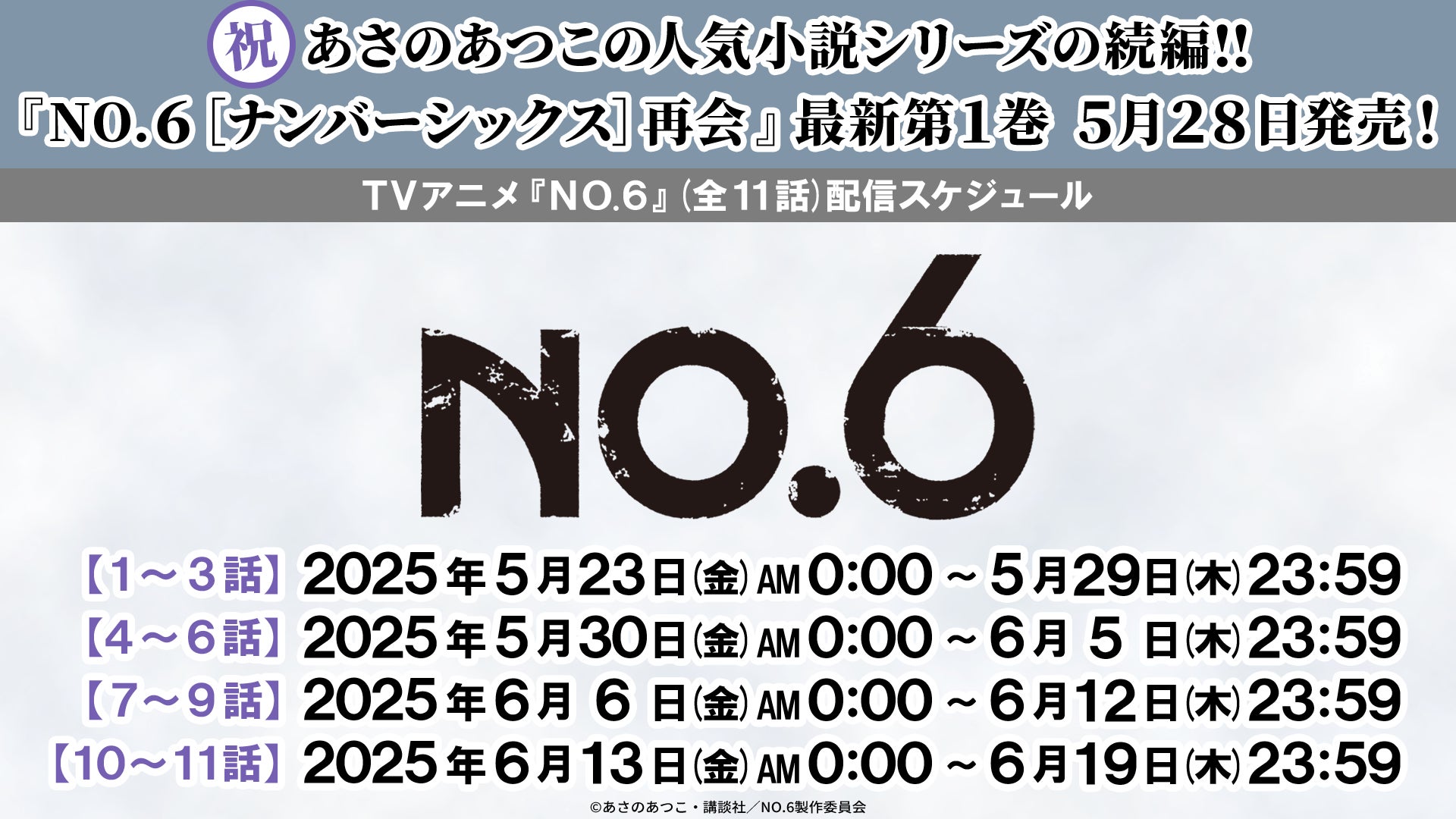 『バッテリー』など数々のヒット作を生み出してきた、あさのあつこ先生が描く『NO.6』待望の新シリーズ『NO.6[ナンバーシックス]再会』第1巻が5月28日より発売!これを記念しまして、講談社が運営するYouTubeチャンネル「フル☆アニメTV」でTVアニメ『NO.6』全11話を期間限定で順次無料配信いたします。【1~3話】を本日5月23日か5月29日まで、【4~6話】を5月30日から6月5日まで、【7~9話】を6月6日から6月12日まで、【10~11話】を6月13日から6月19日までの期間限定配信となりますので、最新作『NO.6[ナンバーシックス]再会』と一緒にぜひお楽しみください!
