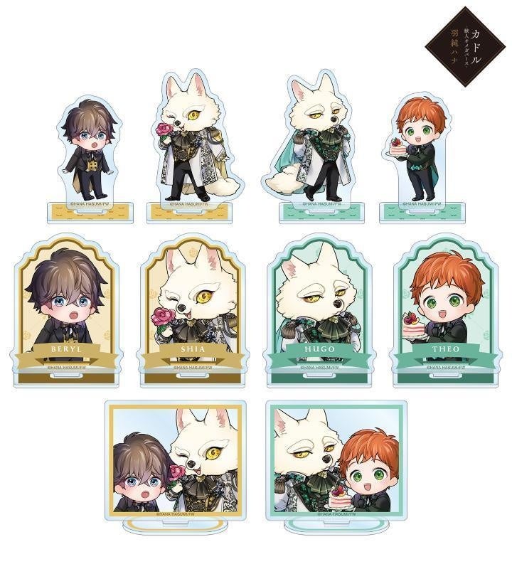 羽純ハナ先生描き下ろしちびキャライラストのベリル、シャイア、ヒューゴ、テオをアクリルスタンドに仕上げました。