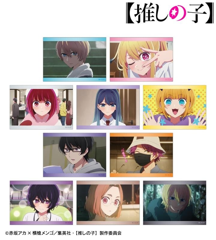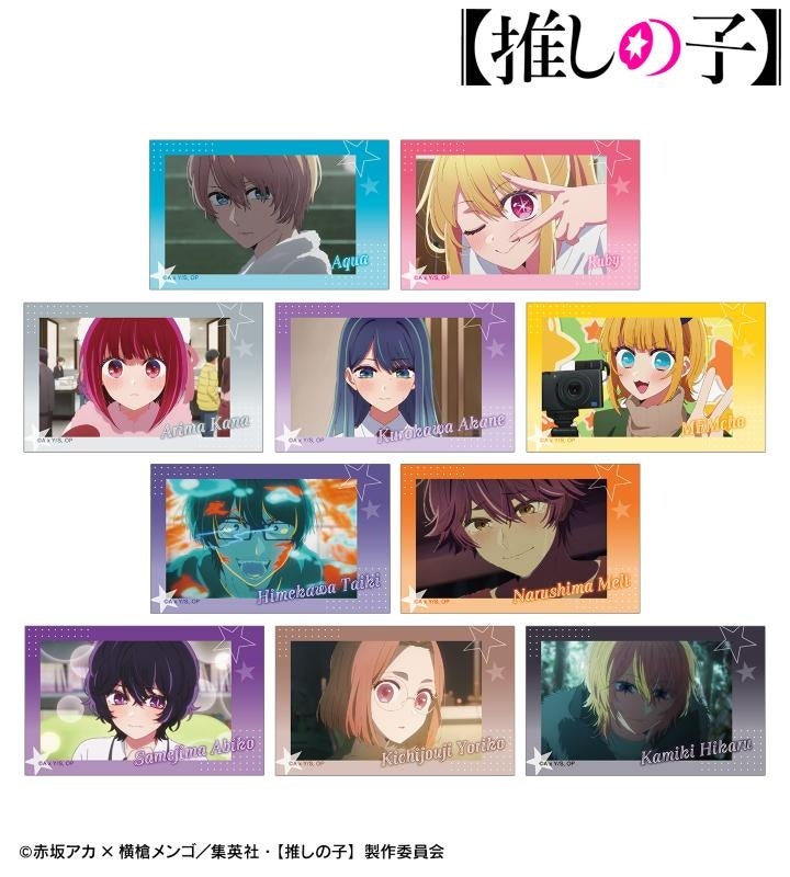 アクア、ルビー、有馬かな、黒川あかね、MEMちょ、姫川大輝、鳴嶋メルト、鮫島アビ子、吉祥寺頼子、カミキヒカルの印象的なシーンをブロマイドに仕上げました。