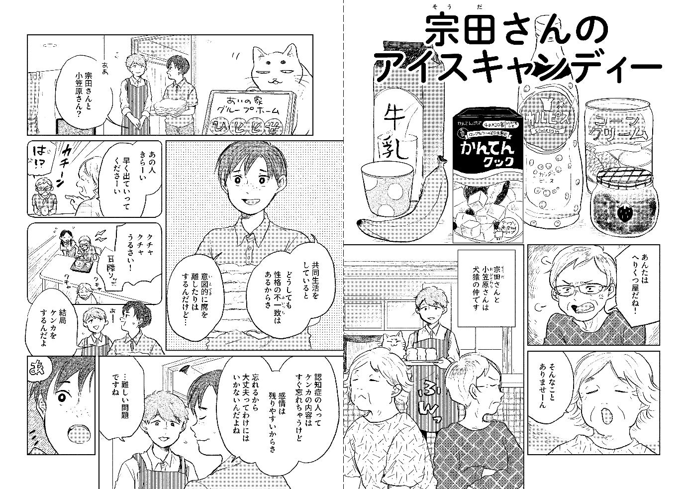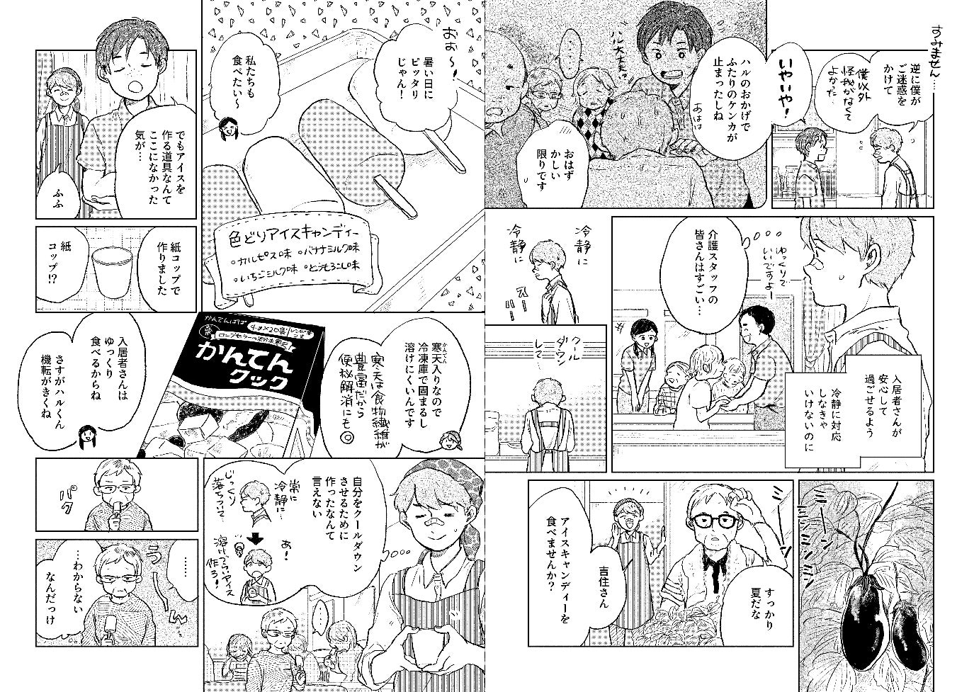 3巻は、冷たい物でクールダウンしたくなる初夏のお話。仲が良いのか悪いのか? 気がつくと言い合いをしている入居者2人に主人公が翻弄されます。また、食品メーカーとのコラボ企画として各話で登場する食材を「健達ねっと」で紹介しています。