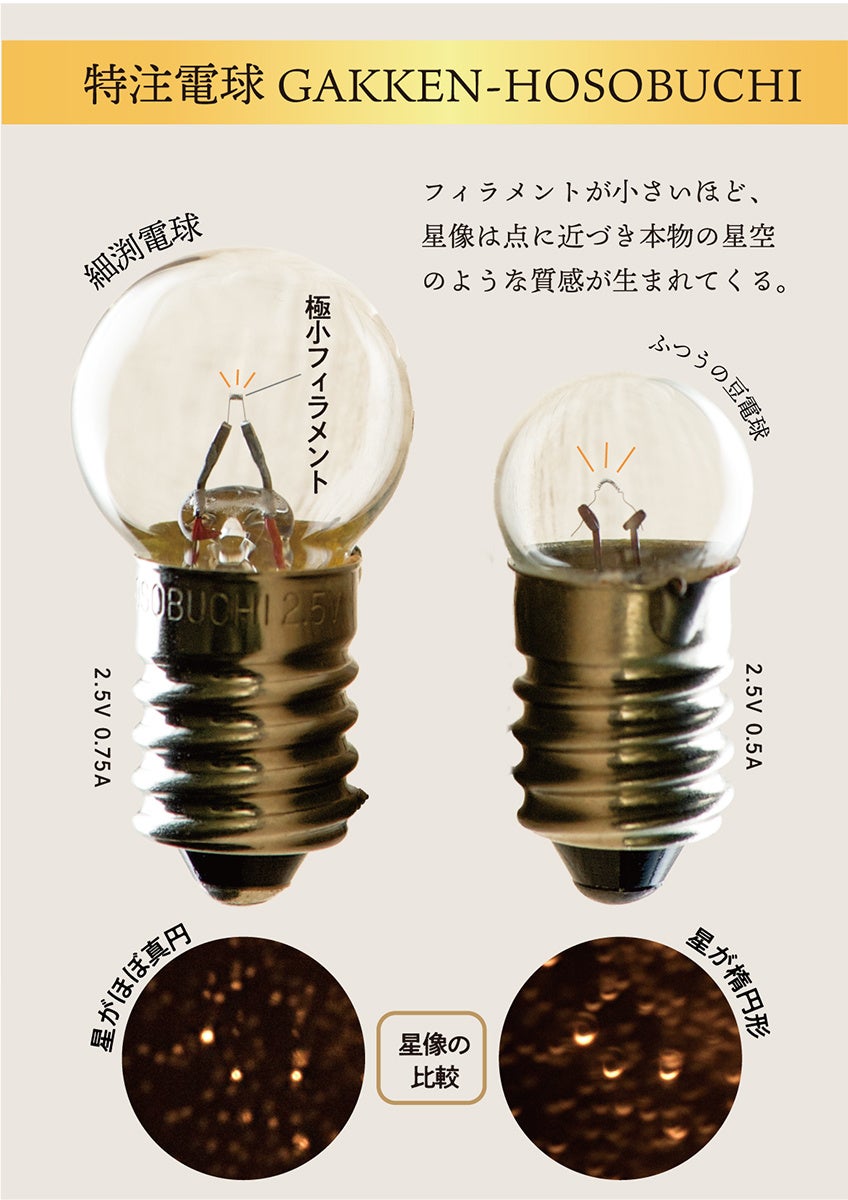 ひとつの光源で全天に投影するピンホール式プラネタリウムは、光を全方向に均等に放射しなければならないため、LEDより電球の方が光源として向いています。また星像を本物の星空に近づけるために、電球のフィラメントはより小さく明るいものが要求されます。特注電球「GAKKEN-HOSOBUCHI」はわずか0.55mmの極小フィラメントを持ち、ピンホール式プラネタリウムの性能を格段に上げる専用電球です。製造は日本の細渕電球株式会社。日本や世界でも残り少なくなった手作りでの電球製造を行う会社です。付属の電球(2個入)は機械では生産が不可能な高精度が求められるため、卓越した技術を持つ細渕電球の職人がひとつひとつ手作業でつくる数量限定の特別生産品です。