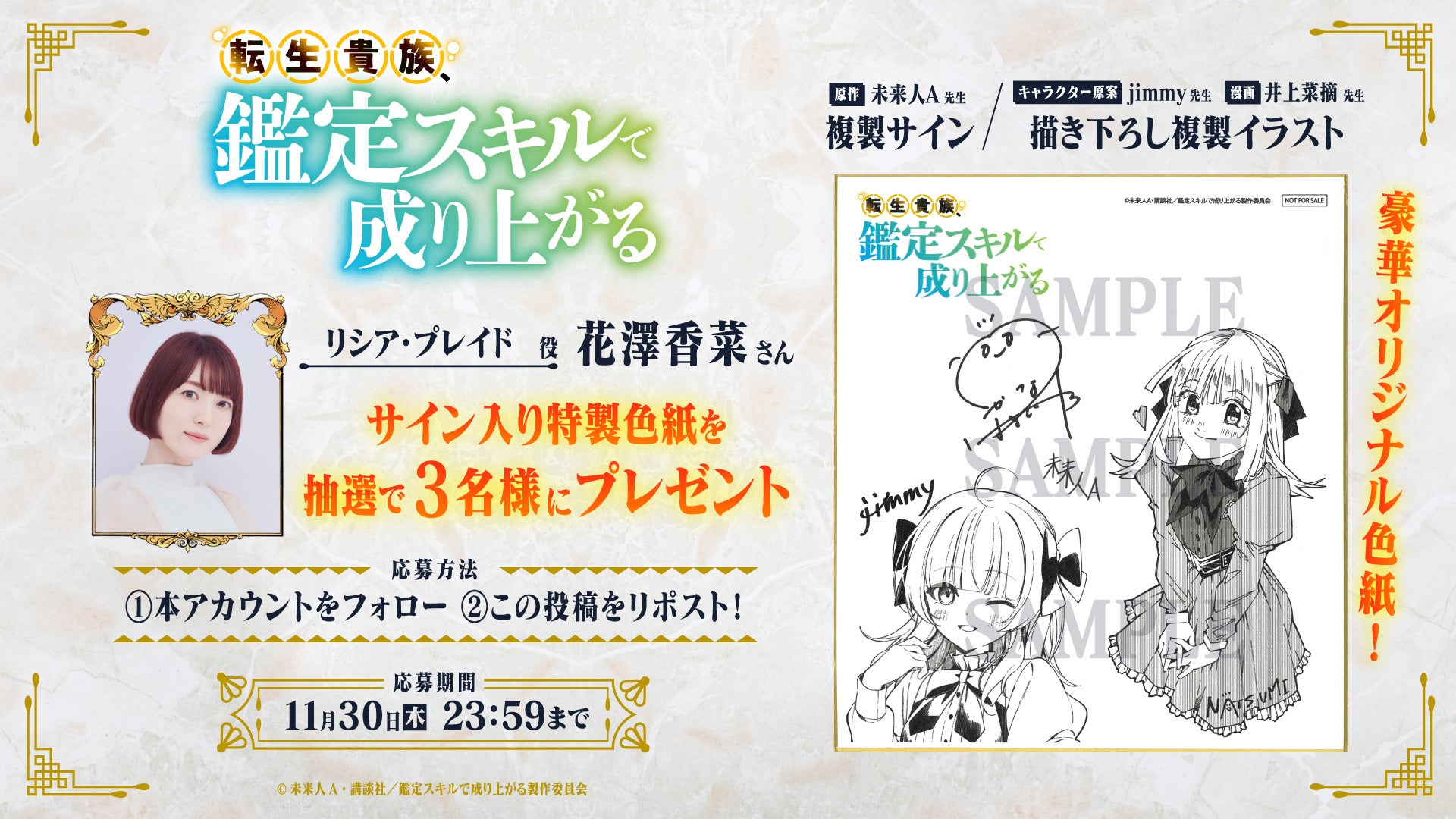 あわせて『転生貴族、鑑定スキルで成り上がる』公式X(旧: Twitter)アカウントでは、本日11月9日(木)からリシア・プレイド役 花澤香菜さんサイン入り色紙プレゼントのフォロー&リポストキャンペーン第6弾を実施いたします。