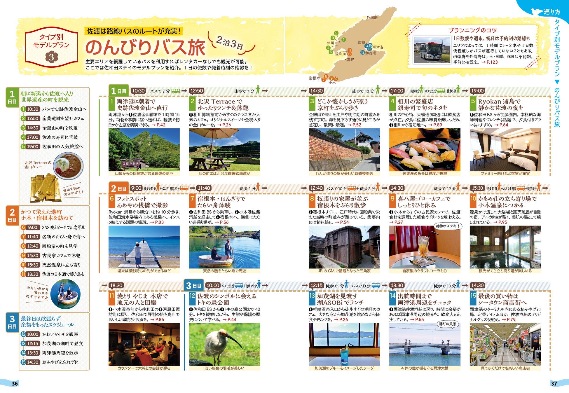 編集部おすすめのモデルプランを3つご紹介。佐渡はレンタカーで自由に巡るもよし、充実したバスルートを活用してのんびり移動するもよし。自分の旅のスタイルに合わせて、ぴったりのコースを選べます。