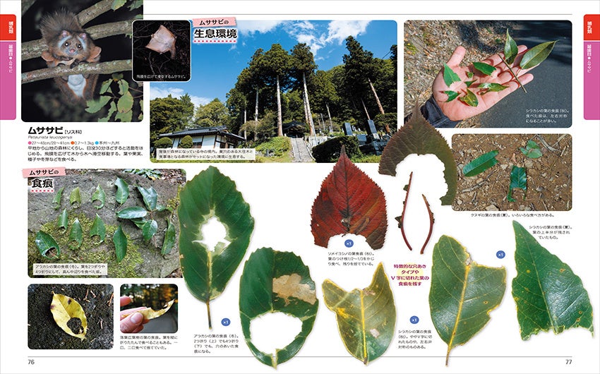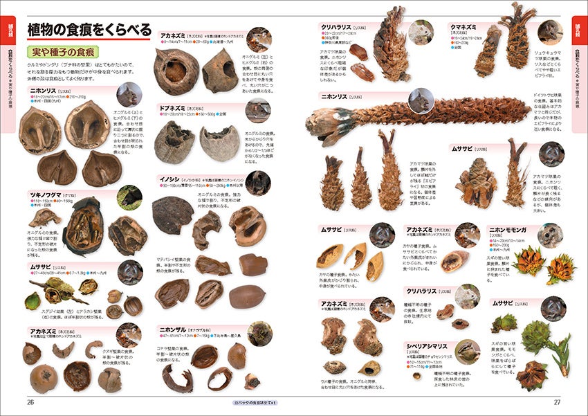 本書は身近で見られる哺乳類や鳥類の足跡や食痕、フンなどについて、似ているものを見開きに並べて比較し、紹介した図鑑です。白い背景で撮影された写真の多くは実物大で掲載しているので、実物と見比べての比較もしやすくなっています。