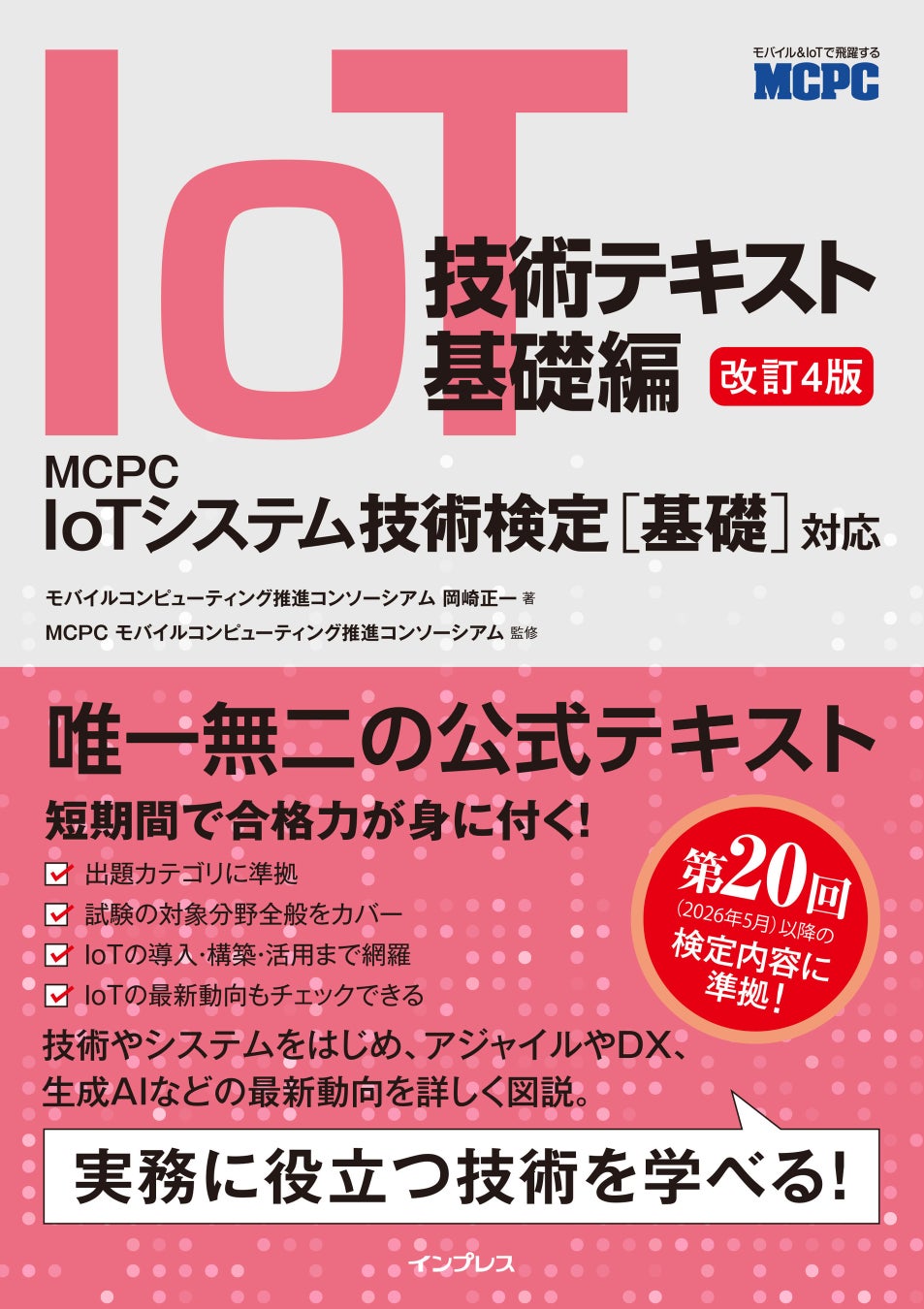 インプレスグループでIT関連メディア事業を展開する株式会社インプレス(本社:東京都千代田区、代表取締役社長:高橋隆志)は、MCPCが実施する、IoTシステム技術検定[基礎]CBT方式に準拠した公式テキスト『IoT技術テキスト 基礎編 改訂4版 MCPC IoTシステム技術検定[基礎]対応』を2026年3月25日(水)に発売いたします。