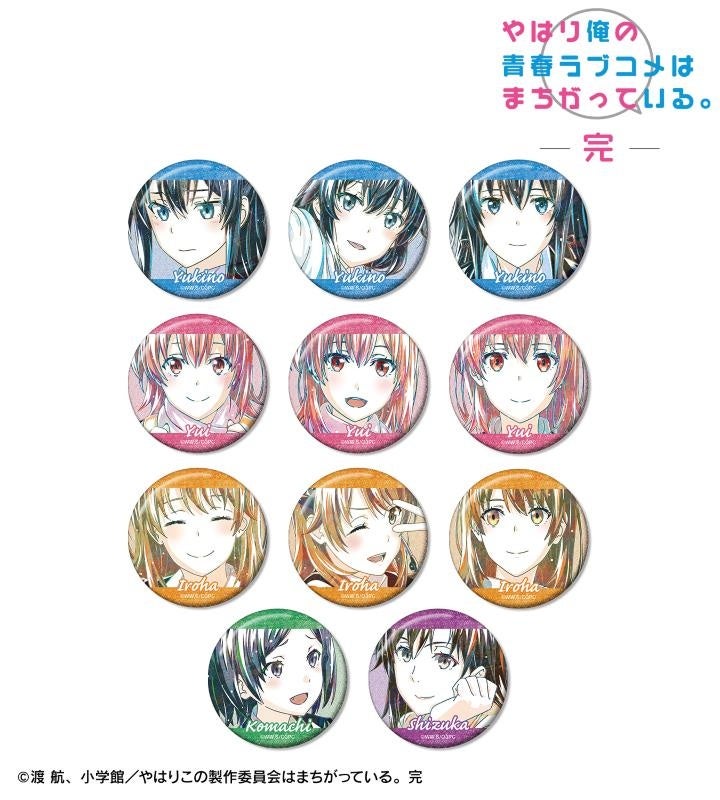 雪ノ下雪乃、由比ヶ浜結衣、一色いろは、比企谷小町、平塚 静のイラストを新たなタッチで魅力的に表現し、マットな手触りの缶バッジに仕上げました。