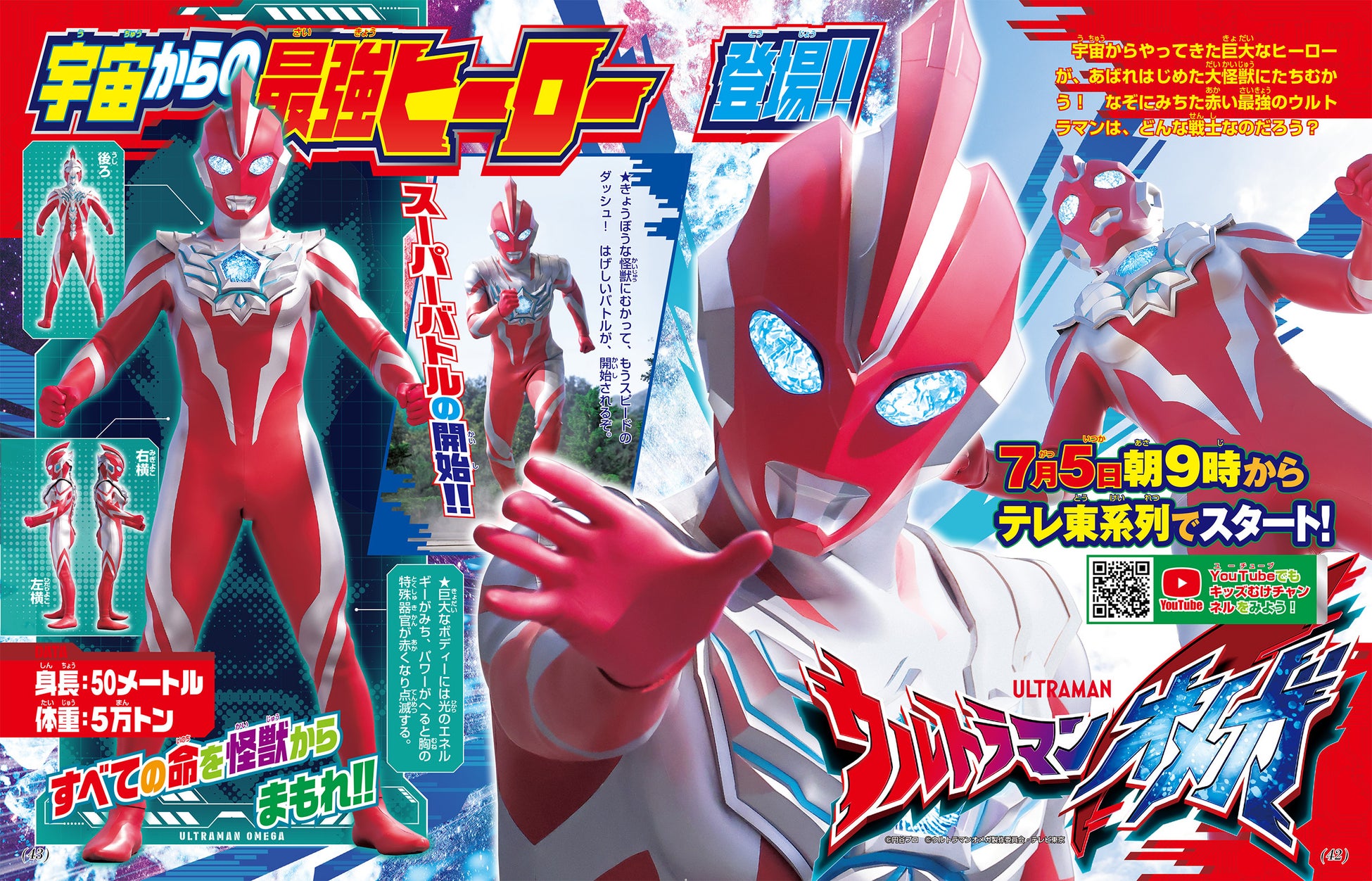 本誌では、新ヒーロー『ウルトラマンオメガ』が初登場! 赤とシルバーのボディに輝く胸のエネルギーコアが特徴で、身長50メートル・体重5万トンの超パワーで怪獣に立ち向かいます。