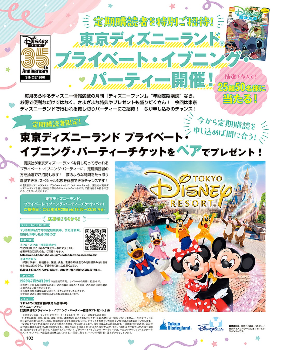 月刊「ディズニーファン」の定期購読者を「東京ディズニーランド® プライベート・イブニング・パーティー」に抽選で25組50名ご招待! 年間定期購読申し込みは今がチャンス!