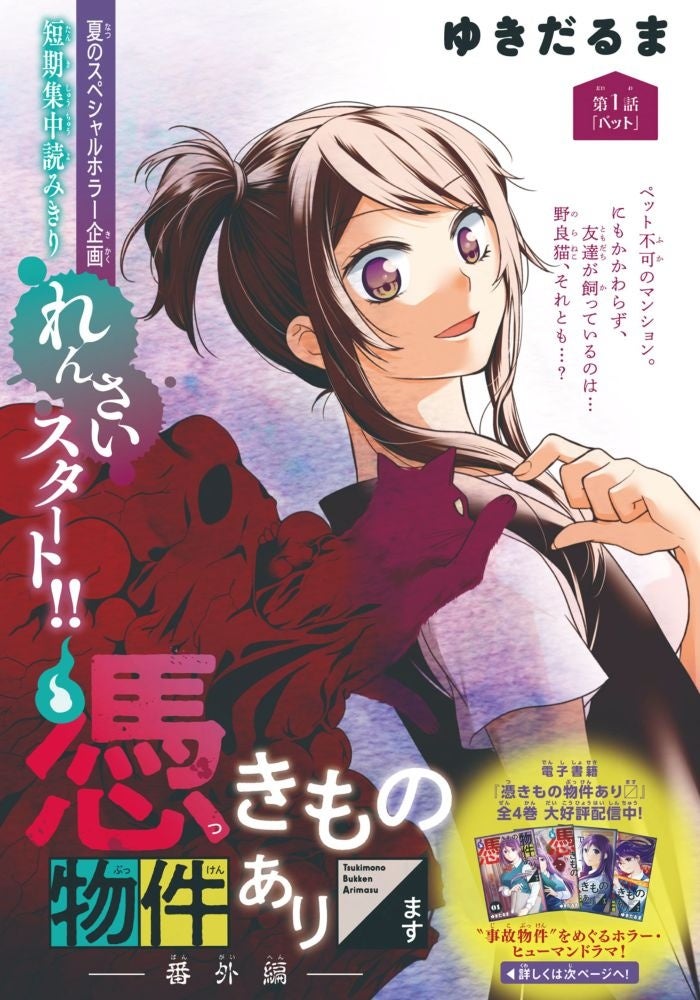 夏といえばホラー!背筋が凍るような恐怖をあなたに…。夏のスペシャルホラー企画・短期集中読みきり連載がスタート[1] !『憑きもの物件ありますー番外編―』(ゆきだるま)第一話が掲載!ナコの友達・メグが住むのはペット不可のマンション。なのに、メグが飼っているのは…野良猫、それとも…?