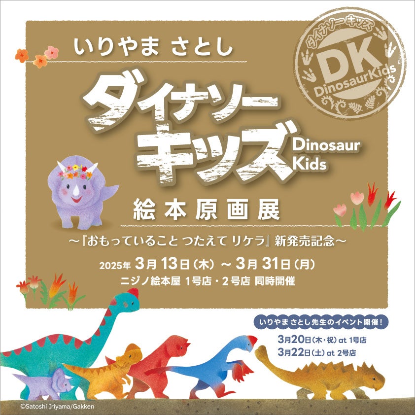 株式会社 学研ホールディングス(東京・品川/代表取締役社長:宮原博昭)のグループ会社、株式会社 Gakken(東京・品川/代表取締役社長:南條達也)が発行する「ダイナソーキッズ」シリーズの作者・いりやまさとし先生の絵本原画展を、2025年3月13日(木)〜3月31日(月)に東京・目黒区(最寄り駅:東急東横線都立大学)の「ニジノ絵本屋1号店」と、東京・文京区(東京ドームシティ内)の「ニジノ絵本屋2号店」にて開催いたします。