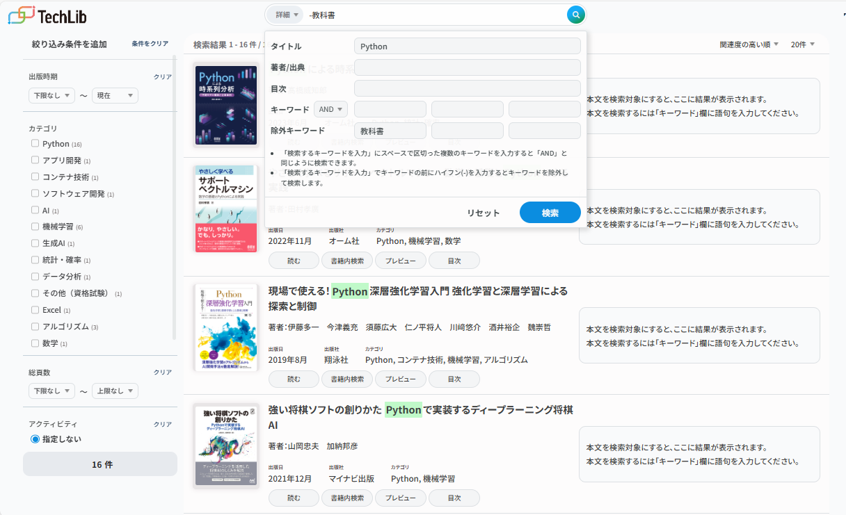 全文検索: タイトルや著者名だけでなく、書籍の本文まで全文検索が可能 。