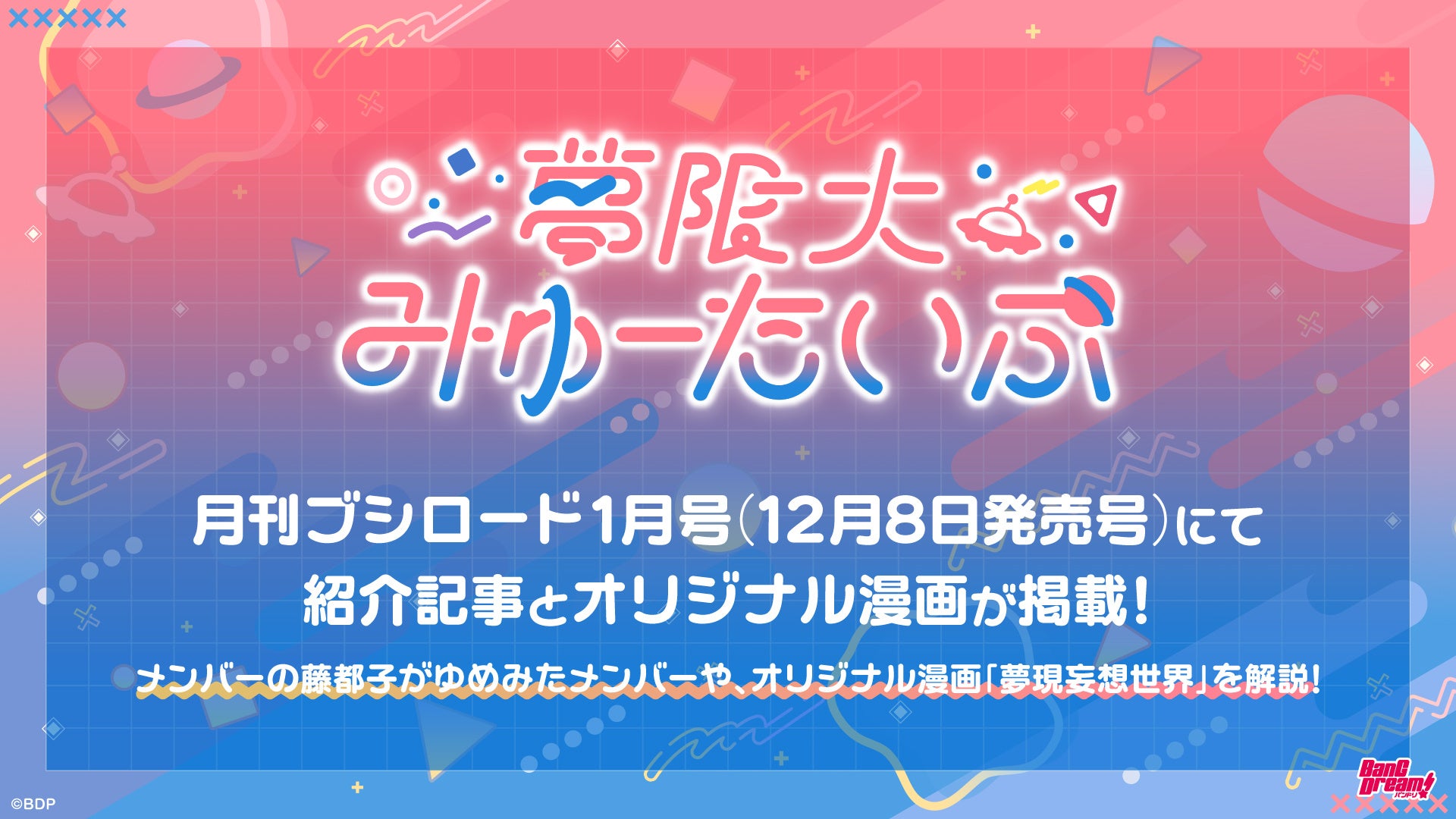月刊ブシロード1月号(12月8日発売号)にて、「夢限大みゅーたいぷ」の紹介記事とオリジナル漫画が掲載されます。メンバーの藤都子による他メンバーの紹介や、オリジナル漫画「夢現妄想世界」の解説を予定しております。