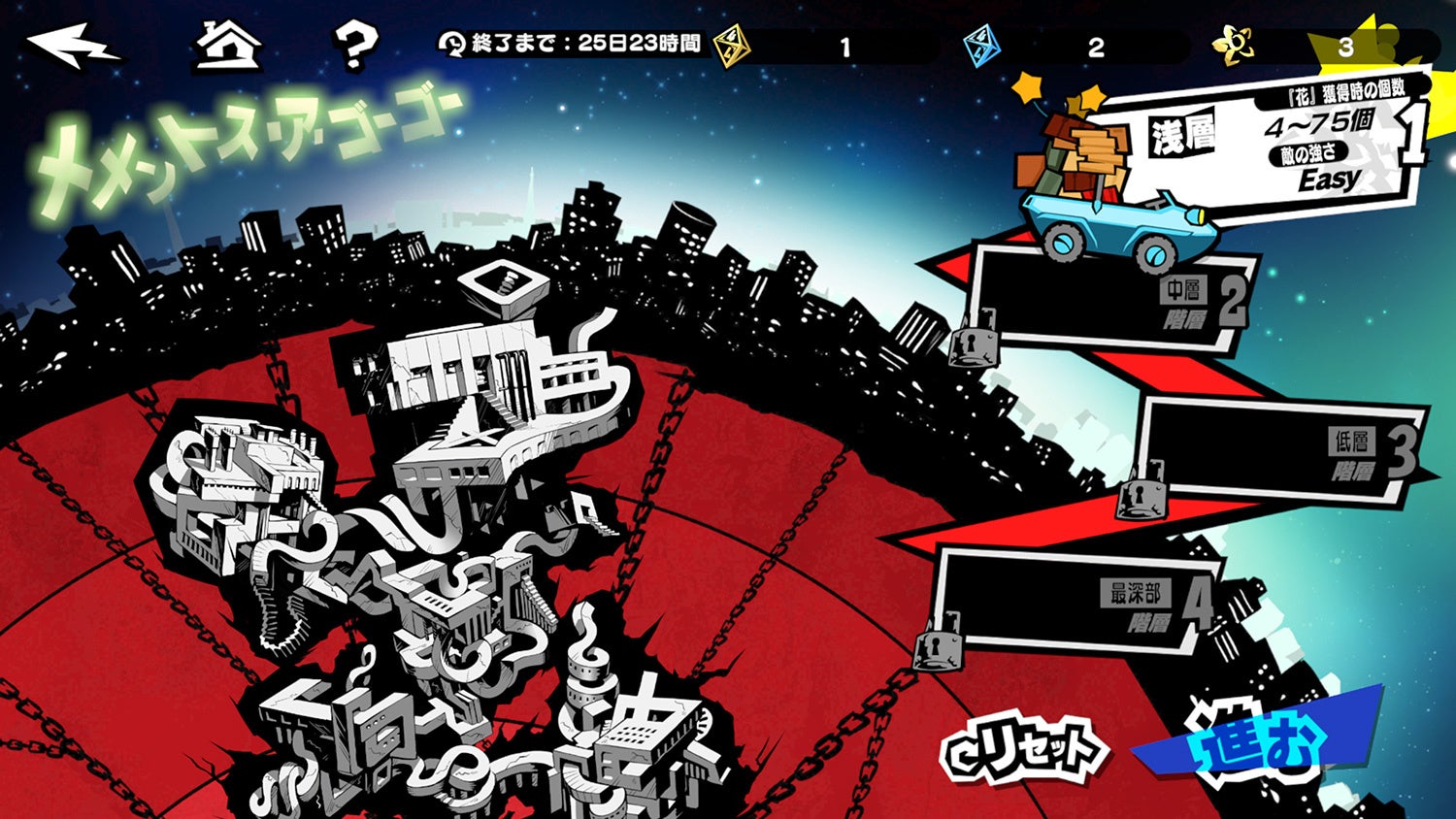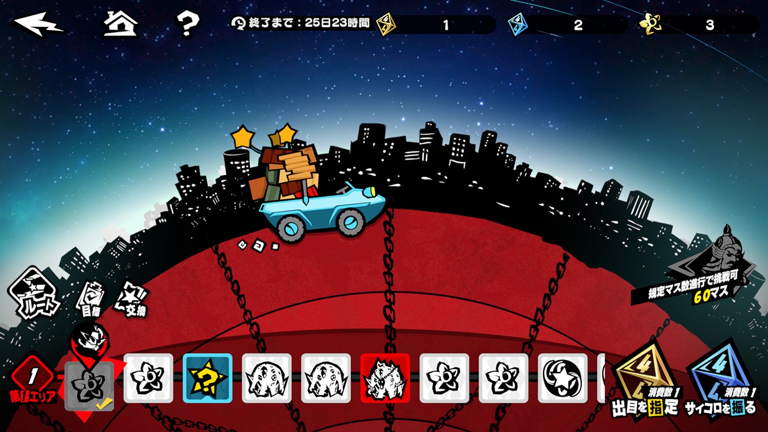 歪みレベルに応じた強大なボスを撃破し、主人公の専用武器などと交換可能な「喚喜のメダル」や、「出目指定サイコロ」を集めましょう。また、撃破済みのレベルには“スタミナモード”が解放されます。“スタミナモード”は体力を消費しての挑戦が可能で、撃破すると「『反逆』のコイン・違」などの報酬が獲得できます。