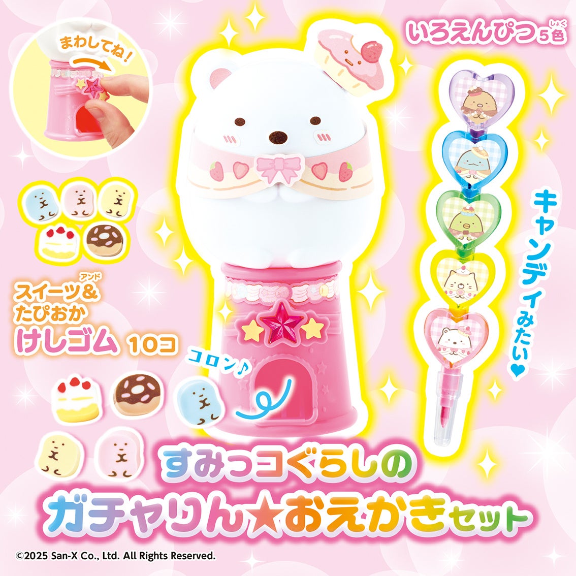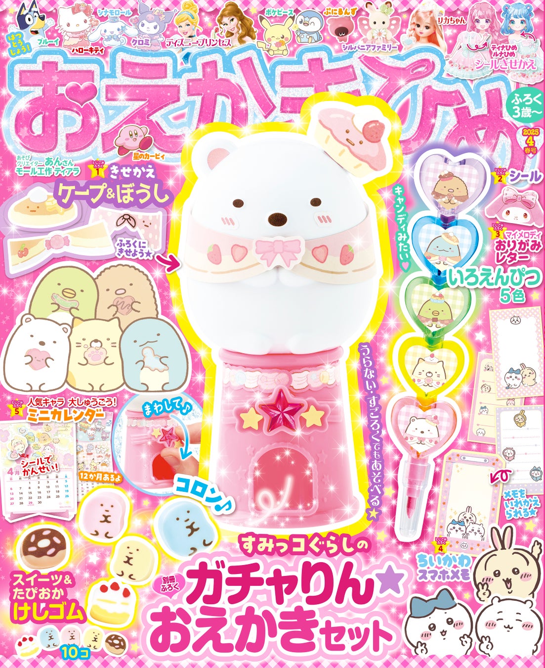 『おえかきひめ 4月(春)号』新発売! 付録は、回すとスイーツ&たぴおかけしゴムが出てくる「すみっコぐらしのガチャりん★おえかきセット」。5色の色えんぴつ付き。