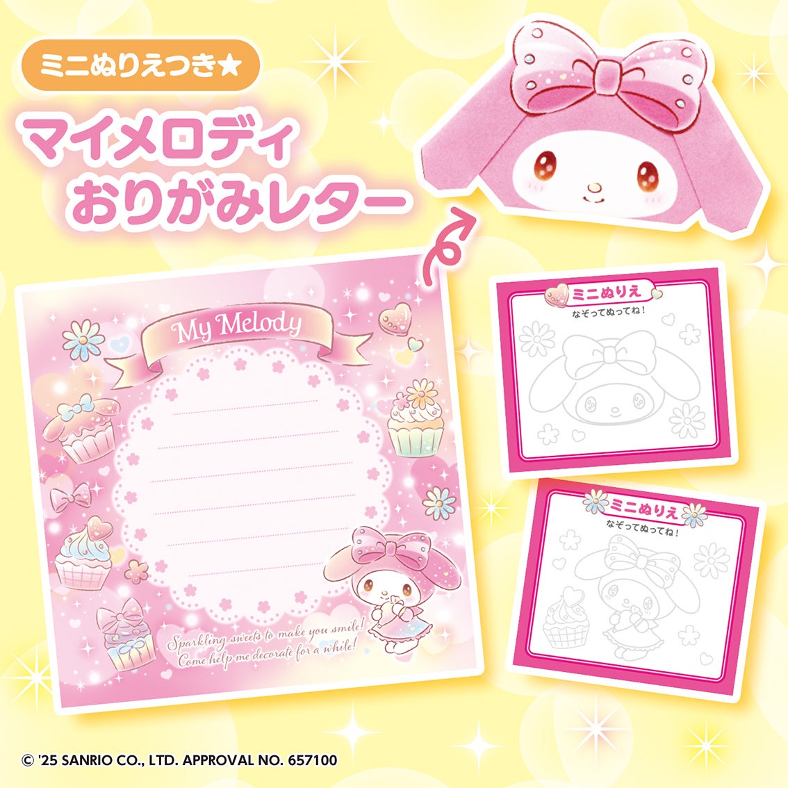 今年50周年を迎えるマイメロディが、かわいい折り紙レターになって登場! スイーツにかこまれたロマンチックなレター面に手紙を書いて折ると、マイメロディの顔の形に大変身! 2種類のミニぬりえもかわいくぬりましょう。