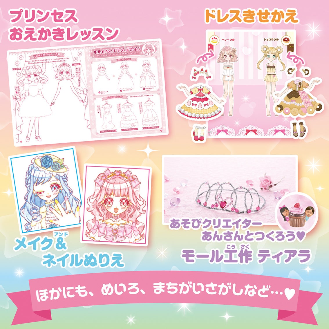 『おえかきひめ』は、おえかきやぬりえ、迷路、間違い探し、折り紙、工作など大人気の遊びを、キャラクターやおひめさまとたっぷり楽しめる、かわいいものが大好きな子ども向け雑誌です。
