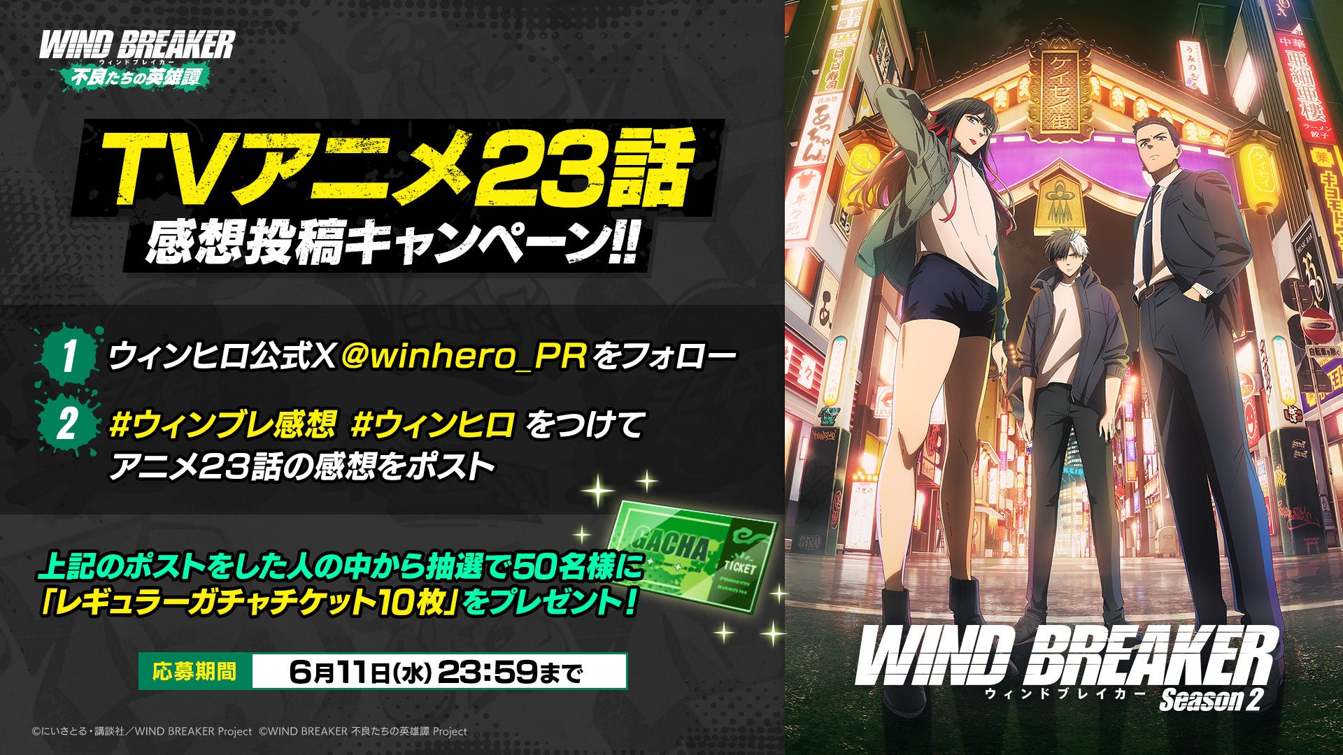 現在放送中のTVアニメ「WIND BREAKER Season 2」の感想にハッシュタグを付けてXに投稿することで、レギュラーガチャチケット10枚が当たるTVアニメ連動キャンペーンを毎週開催中です。