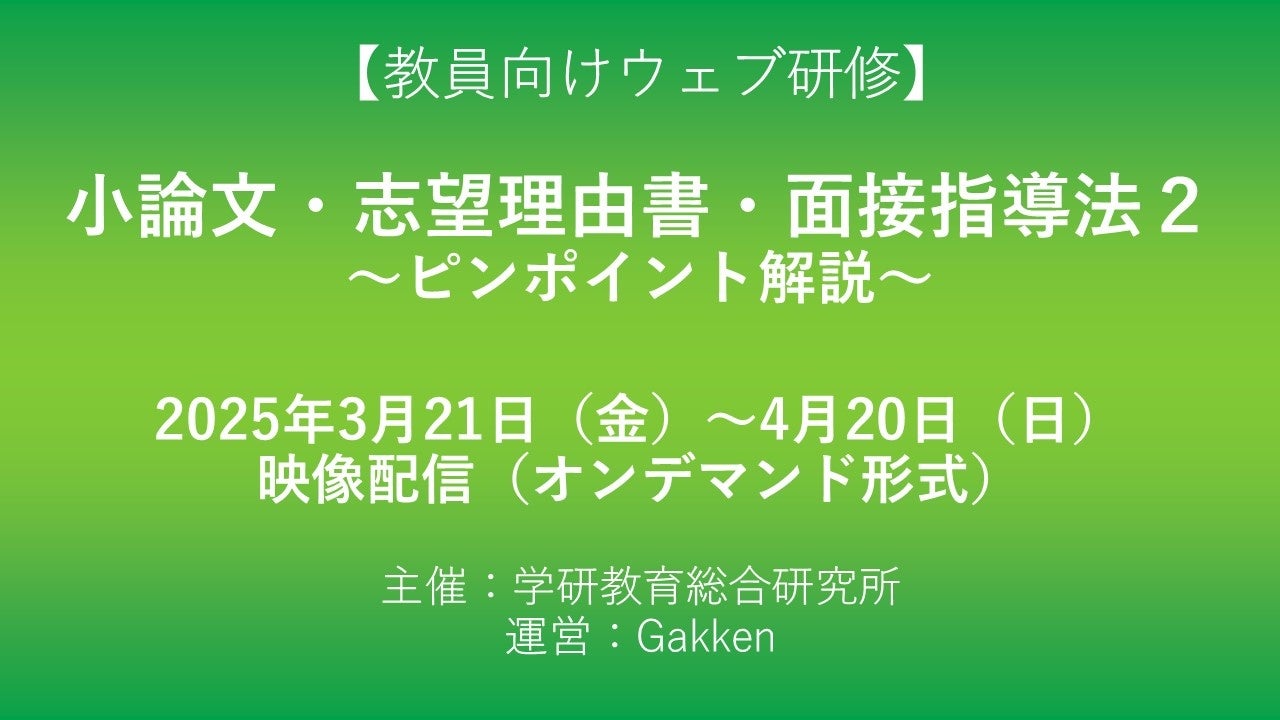 株式会社 学研ホールディングス(東京・品川/代表取締役社長:宮原博昭)のグループ会社、株式会社Gakken(東京・品川/代表取締役社長:南條達也)は、高等学校教員を対象としたウェブ研修「小論文・志望理由書・面接指導法2」を実施いたします。研修会期は2025年3月21日(金)から4月20日(日)までの1カ月間。オンデマンド形式の配信を採用しており、受講者のご都合に合わせて自由に何度でも受講することができます。同研修は2024年に続き、二度目の開催となります。