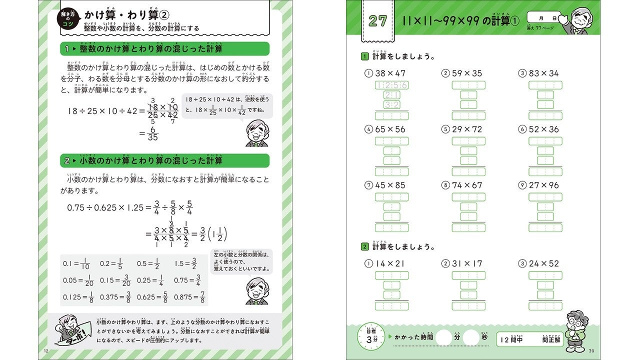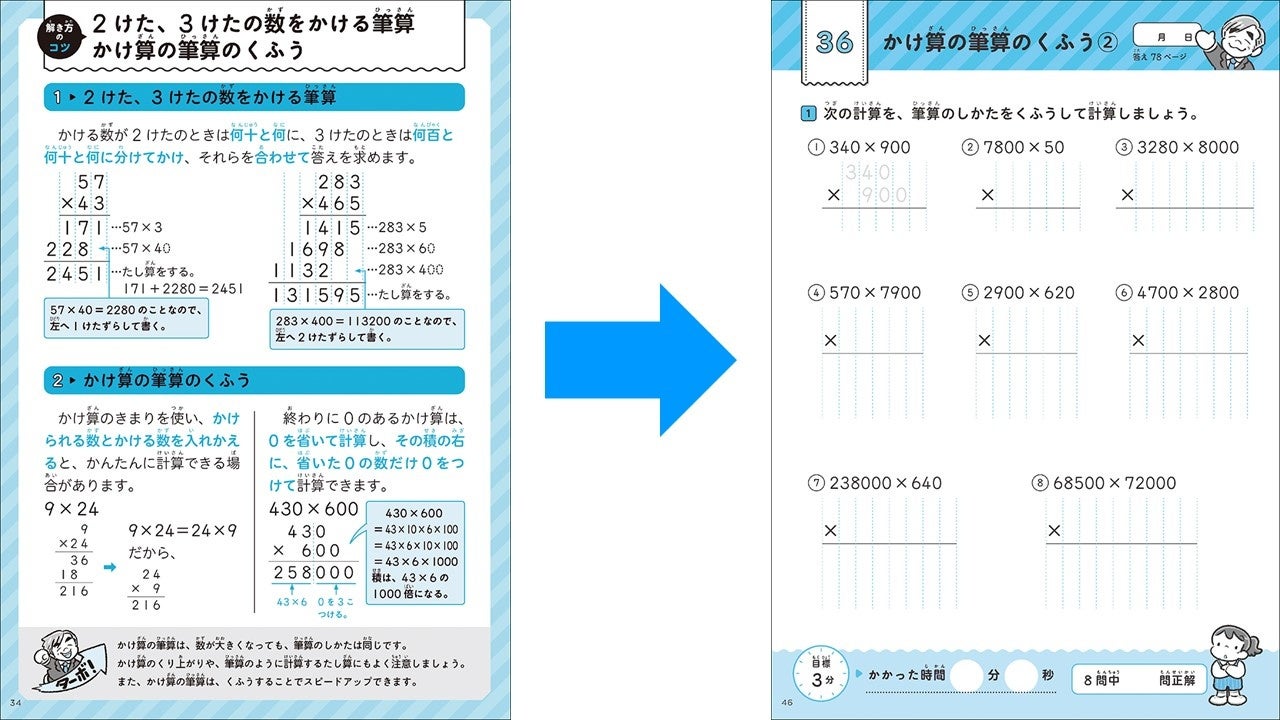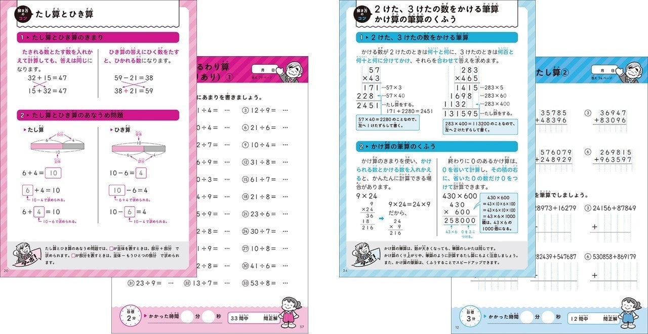 1回の学習は1ページ。はじめに、「解き方のコツ」のページで計算のしかたやコツを学習します。ていねいに説明しているので、学校で習っていない内容でも無理なく一人で学習を進めることができます。次に、問題ページに取り組みます。目標時間を意識して解くことで、計算スピードが驚くほどアップします。