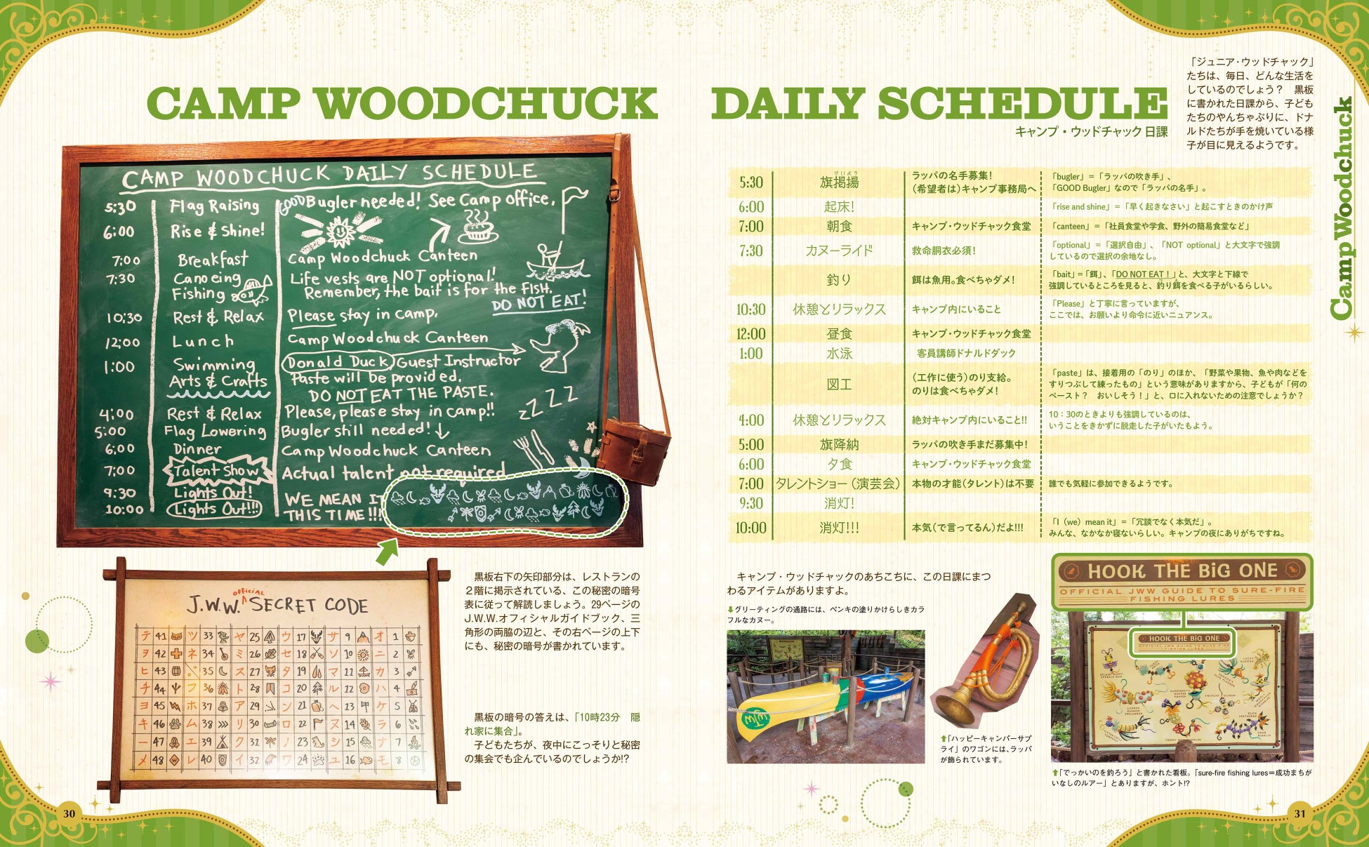 ウエスタンランドの「キャンプ・ウッド・チャック・キッチン」には、ドナルドと3人の甥、ヒューイ、ドゥーイ、ルーイたちのキャンプ生活がのぞき見できます。特にダイニングエリアに置かれた黒板には、ジュニアウッドチャックたちのスケジュールがびっしりと書き込まれています。朝は5:30の旗掲揚から始まり、朝食後にカヌーと釣り。昼食後に水泳、図工の予定。健康的でバランスの取れたスケジュールがわかります。