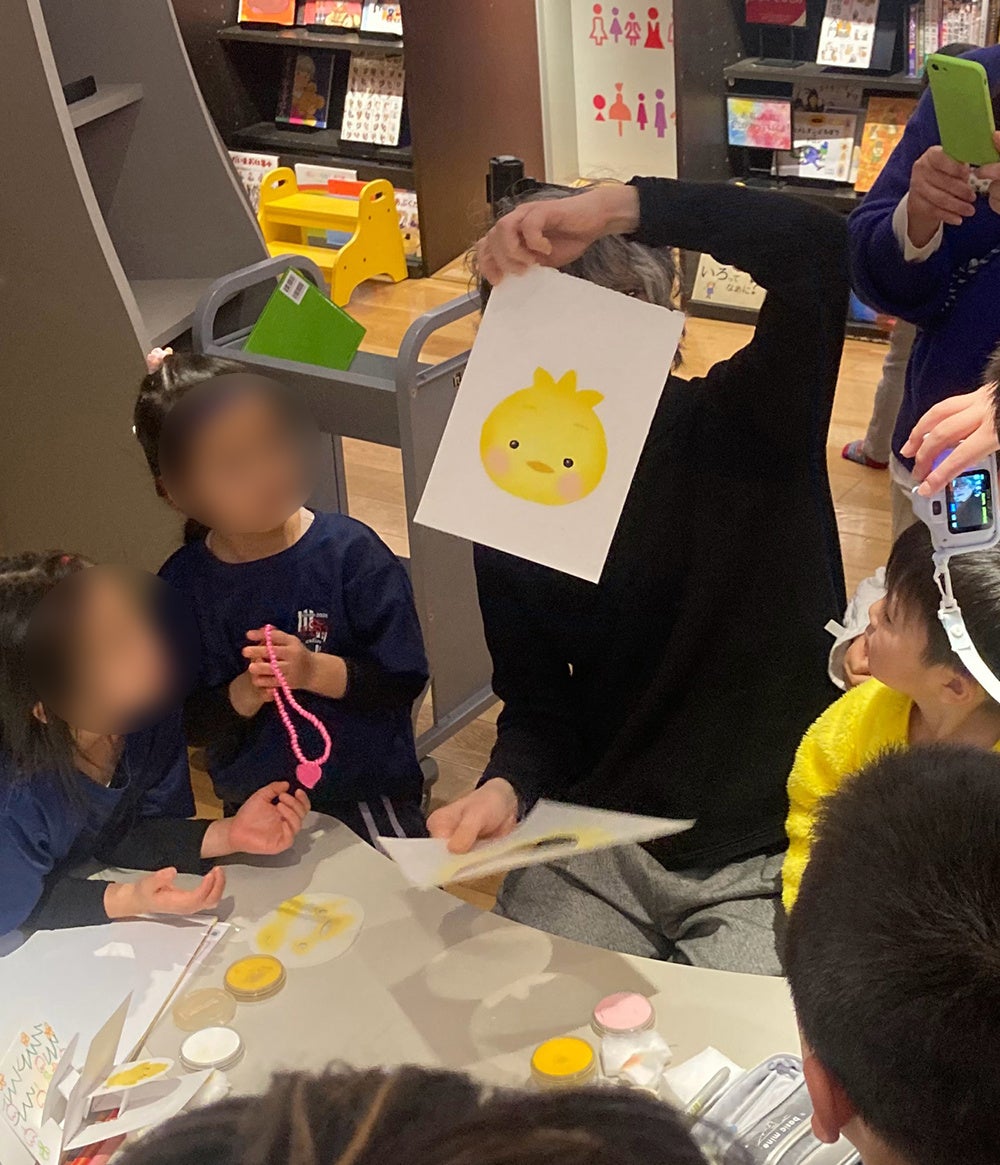 クイズ大会に続いて、今度はポップアップのぴよちゃんカード作りのイベントです。「絵と言葉のライブラリー ミッカ」のアトリエにて、ご予約いただいた15組の親子といっしょにワークショップを楽しみました。