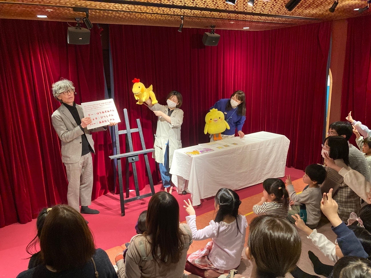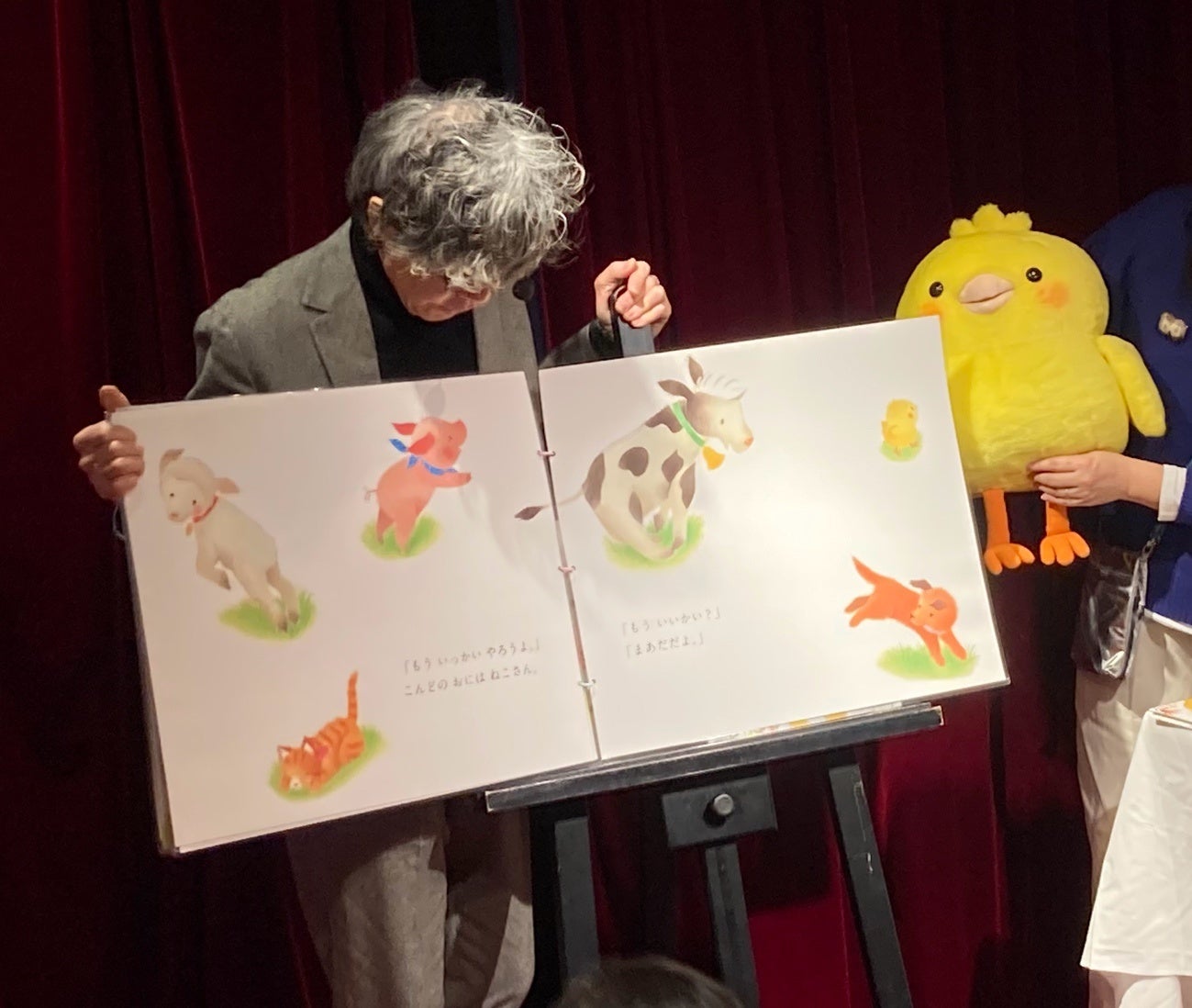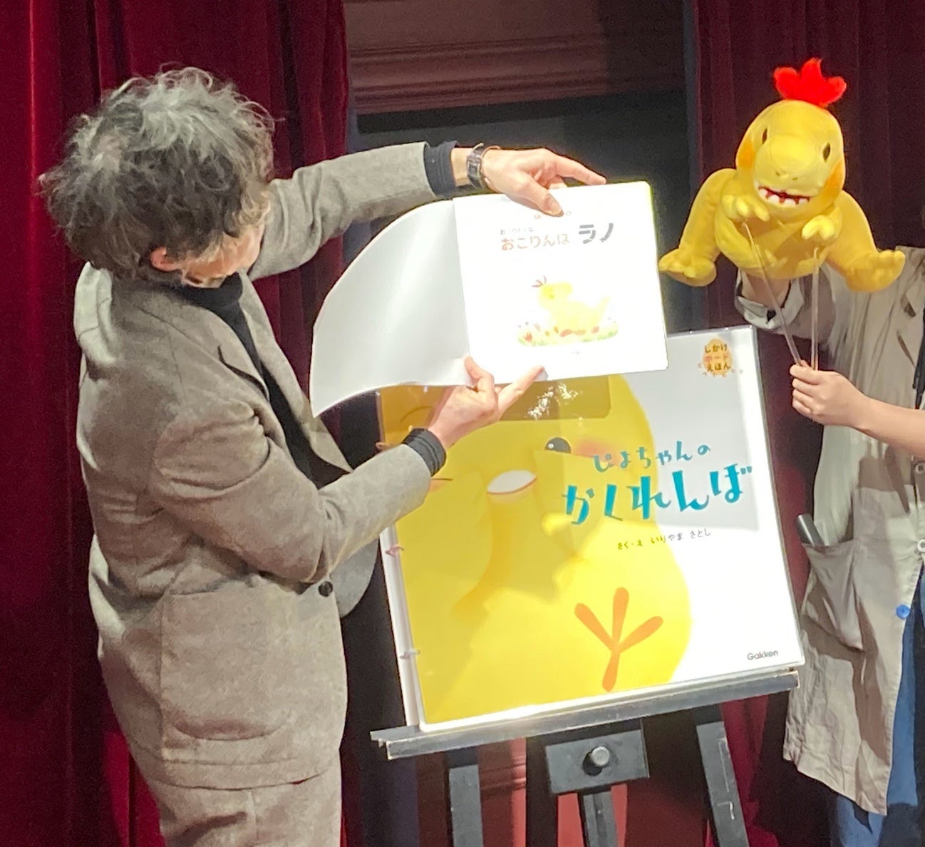 司会の方がいりやま先生をご紹介し、拍手とともにカーテンの陰からいりやま先生が登場! そして、いりやま先生の絵本の登場人物「ぴよちゃん」のパペットもいりやま先生の呼びかけで登場! かわいいパペットの登場で小さなお子さまたちも笑顔になる中、いりやま先生の絵本『ぴよちゃんのかくれんぼ』と『おこりたくないおこりんぼのラノ』(共にGakken刊)をいりやま先生ご自身が読み聞かせ。『ぴよちゃんのかくれんぼ』は特別製の大型絵本による読み聞かせです。