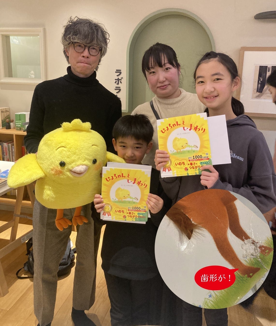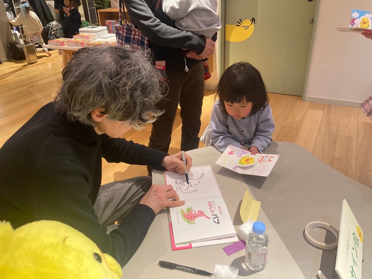 サイン会ご参加の方のなかには、小学生のご姉弟が赤ちゃんの頃に愛読していた『ふわふわだあれ?』を持ってきてくださった方も! 「大好きすぎて、よく噛んでいたので歯形がついているんですよ」と、大切そうに見せてくださいました。絵本は心の栄養といいますが、きっとじっくり味わってくれたのでしょうね。姉弟とそろってぴよちゃんが大好きだったそうで、よく読み聞かせをしてくださったそうです。このエピソードに、いりやま先生も編集部も感激していました。