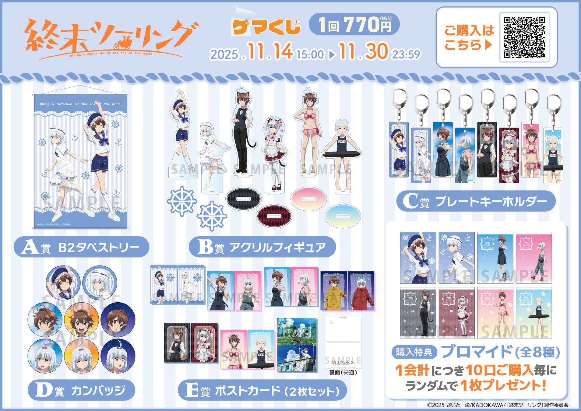 株式会社カードラボ ゲーマーズ(本社:東京都豊島区、https://www.gamers.co.jp/ 以下ゲーマーズ)は、ハズレなしのオンラインくじサービス「ゲマくじ」にて、2025年11月14日(金)15:00よりアニメ「終末ツーリング」を販売することをお知らせいたします。