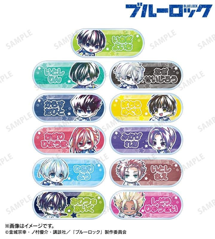 潔 世一、糸師 凛、凪 誠士郎、烏 旅人、蜂楽 廻、千切 豹馬、御影 玲王、氷織 羊、糸師 冴、オリヴァ・愛空、士道 龍聖のデフォルメイラストを新たなタッチで魅力的に表現し、キャラクターカラーに合わせたアクリルネームプレートに仕上げました。