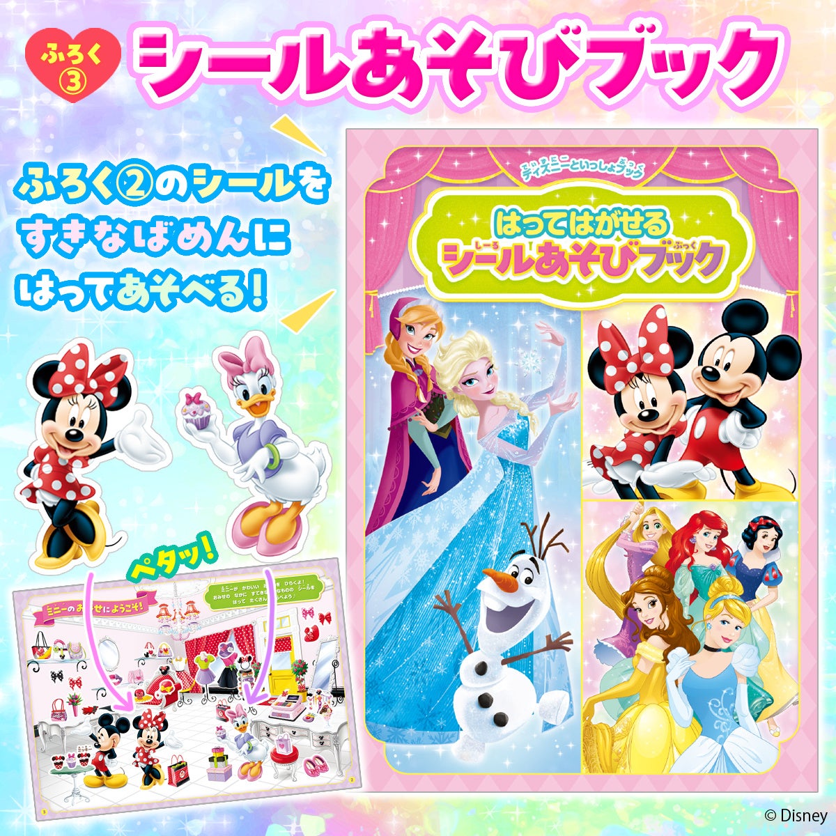 付録の「はってはがせるキャラクターシール」を、好きな場面にペタペタはって遊べるブックです。ミニーのかわいいお店、アナと雪の女王の雪景色、おしゃれなディズニープリンセス、3つの場面に自由にはってはがして、シールあそびが楽しめます!