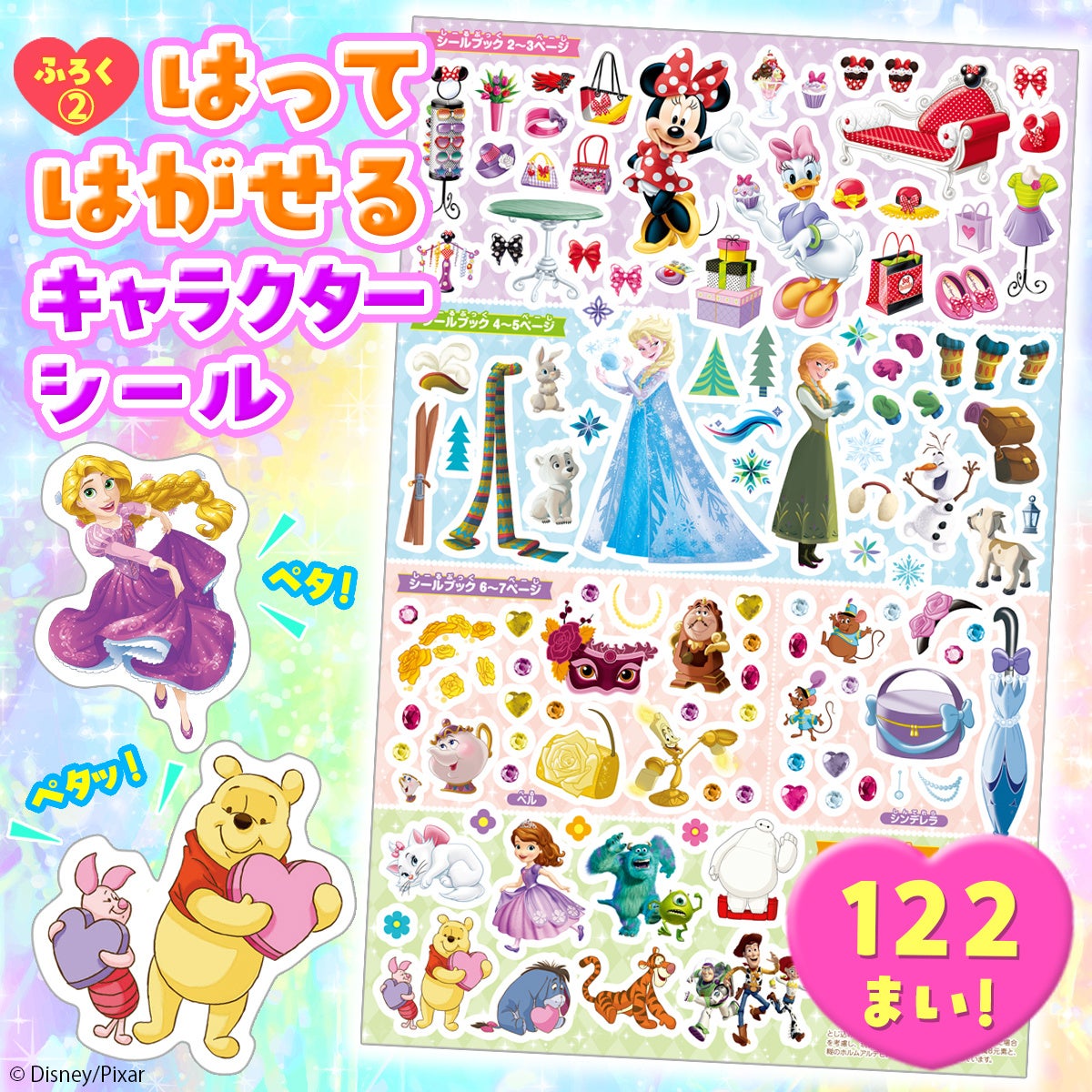 エルサとアナ、ラプンツェル、アリエル、ミニー、プーさんなど、大人気のキャラクター勢ぞろいのキャラクターシールがたっぷり122枚! はってはがすことができるから、何度もくり返しはって遊べます!