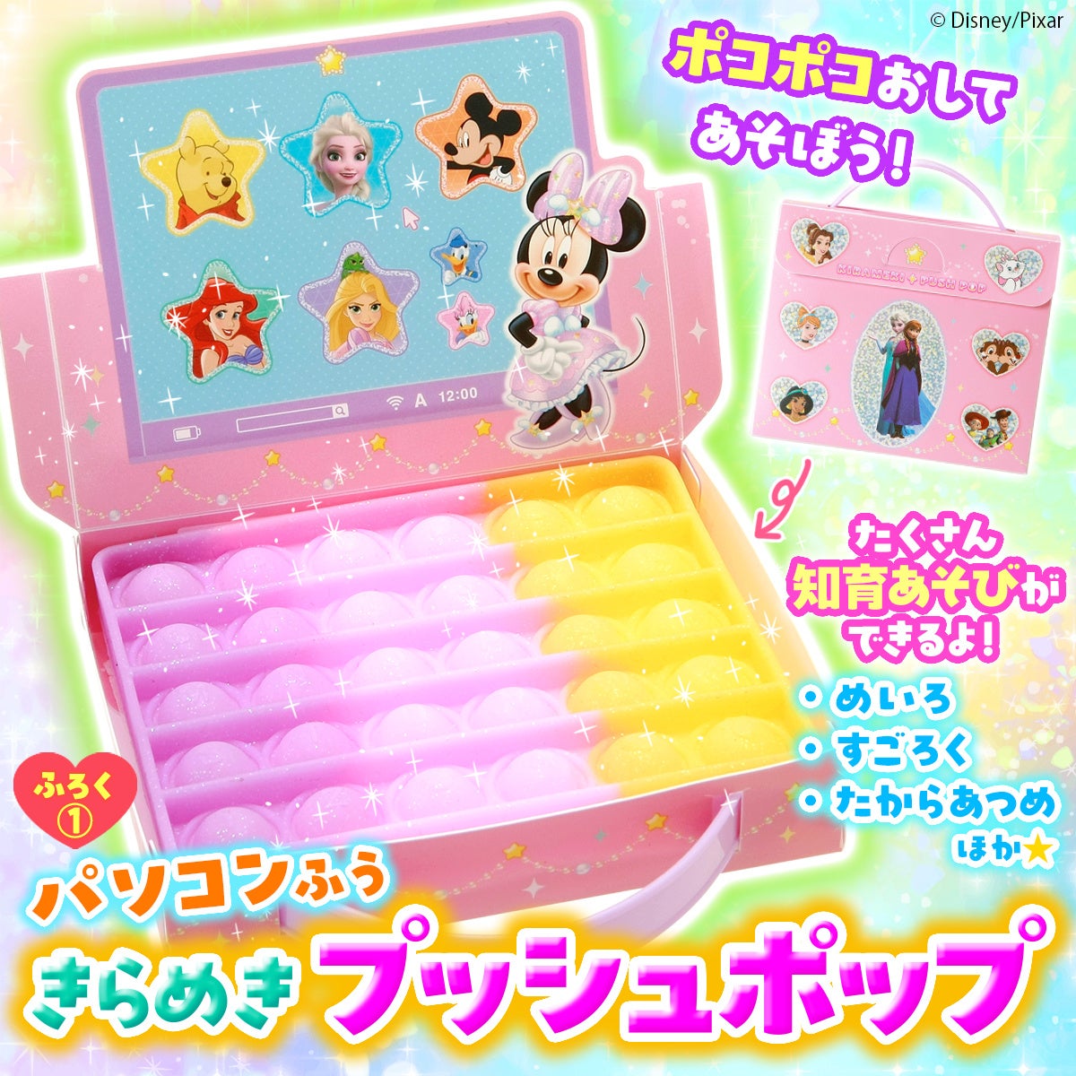 付録はパソコンのようにポコポコ押して遊べるプッシュポップ! かわいいバッグ型ケースを、パソコンふうに組み立てて楽しみます。プッシュポップはラメ入りのキラキラカラー。本誌のとじこみ付録「プッシュポップ★わくわくプレイセット」をいっしょに使えば、めいろ、すごろく、たからあつめほか、楽しみながらさまざまな知育あそびが可能です。