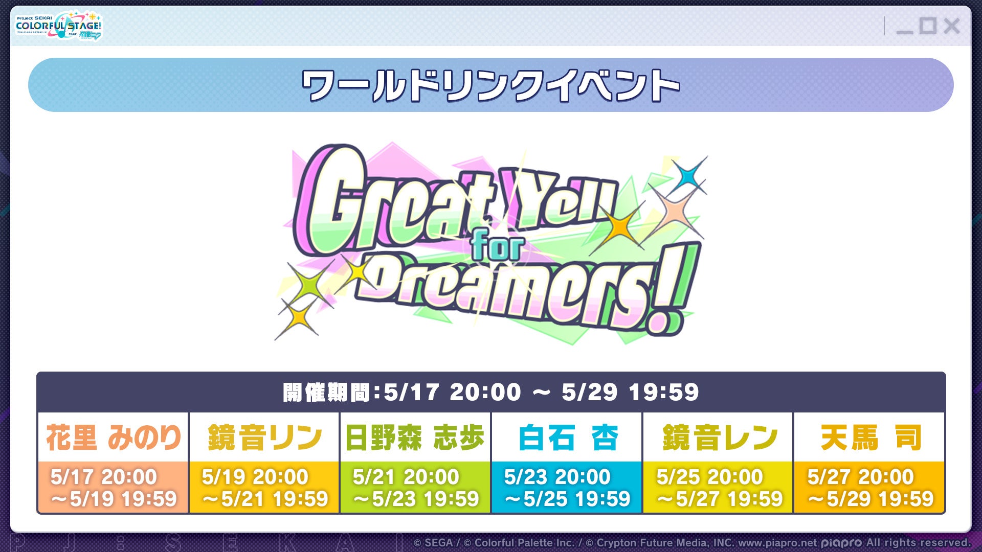 2026年5月17日(日)より、ワールドリンクイベント「Great Yell for Dreamers!」を開催いたします。今回のワールドリンクイベントは、ユニットをシャッフルした特別なメンバー構成となり、Part2のイベントメンバーは、日野森志歩、花里みのり、白石杏、天馬司、鏡音リン、鏡音レンとなります。また、イベント終了時には、イベントメンバーが歌唱する新規書き下ろし楽曲も登場いたします。