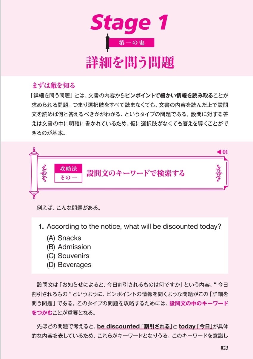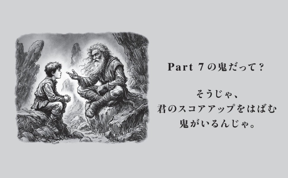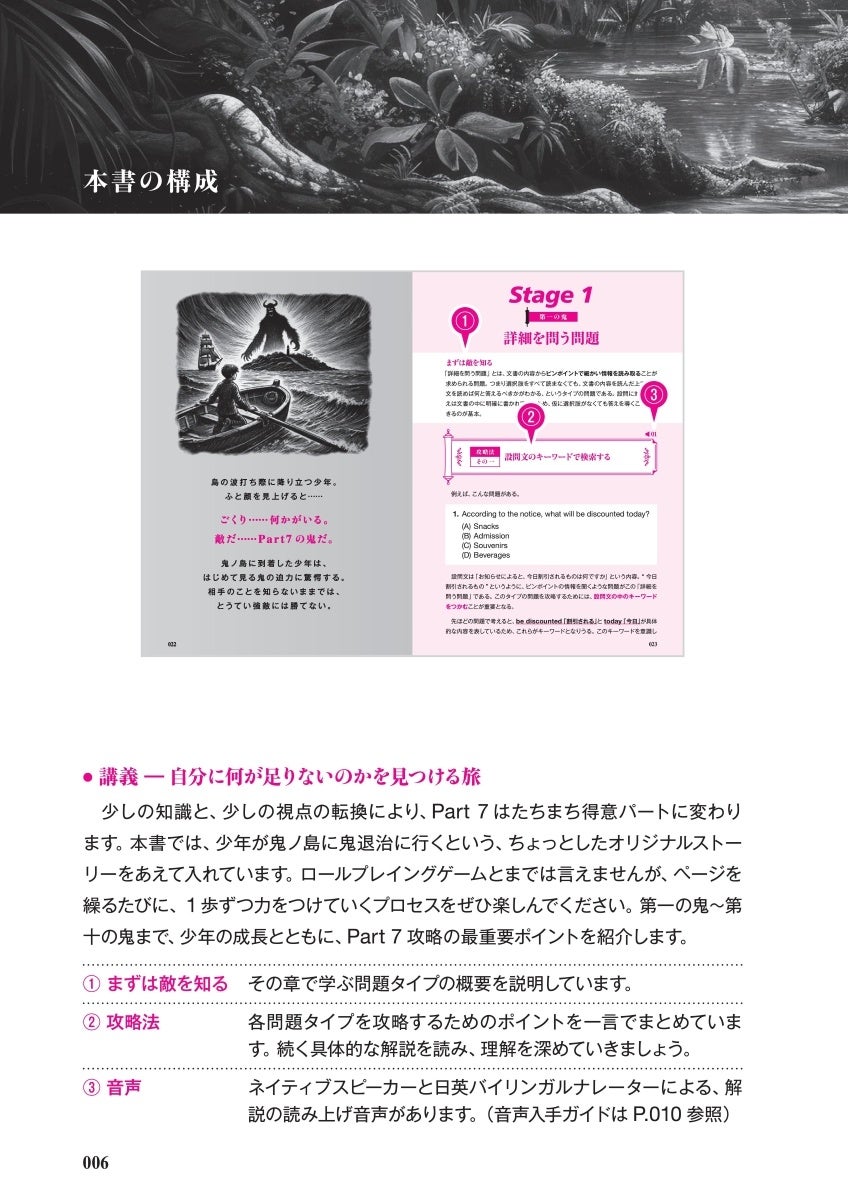 少しの知識と、少しの視点の転換により、パート7はたちまち得意パートに変わります。本書では、少年が鬼ノ島に鬼退治に行くという、ちょっとしたオリジナルストーリーをあえて入れています。ロールプレイングゲームとまでは言えませんが、ページを繰るたびに、1歩ずつ力を付けていくプロセスをぜひ楽しんでください。一の巻~十の巻まで、少年の成長とともに、パート7攻略の最重要ポイントを紹介します。(本文より引用)