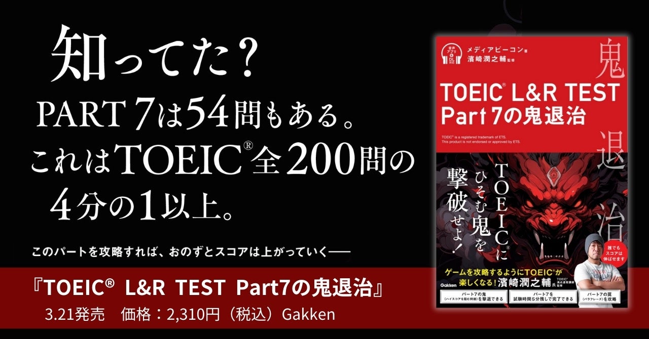 株式会社 学研ホールディングス(東京・品川/代表取締役社長:宮原博昭)のグループ会社、株式会社 Gakken(東京・品川/代表取締役社長:南條達也)は、2025年3月21日(金)に『TOEIC(R) L&R TEST Part7の鬼退治』を発売いたしました。