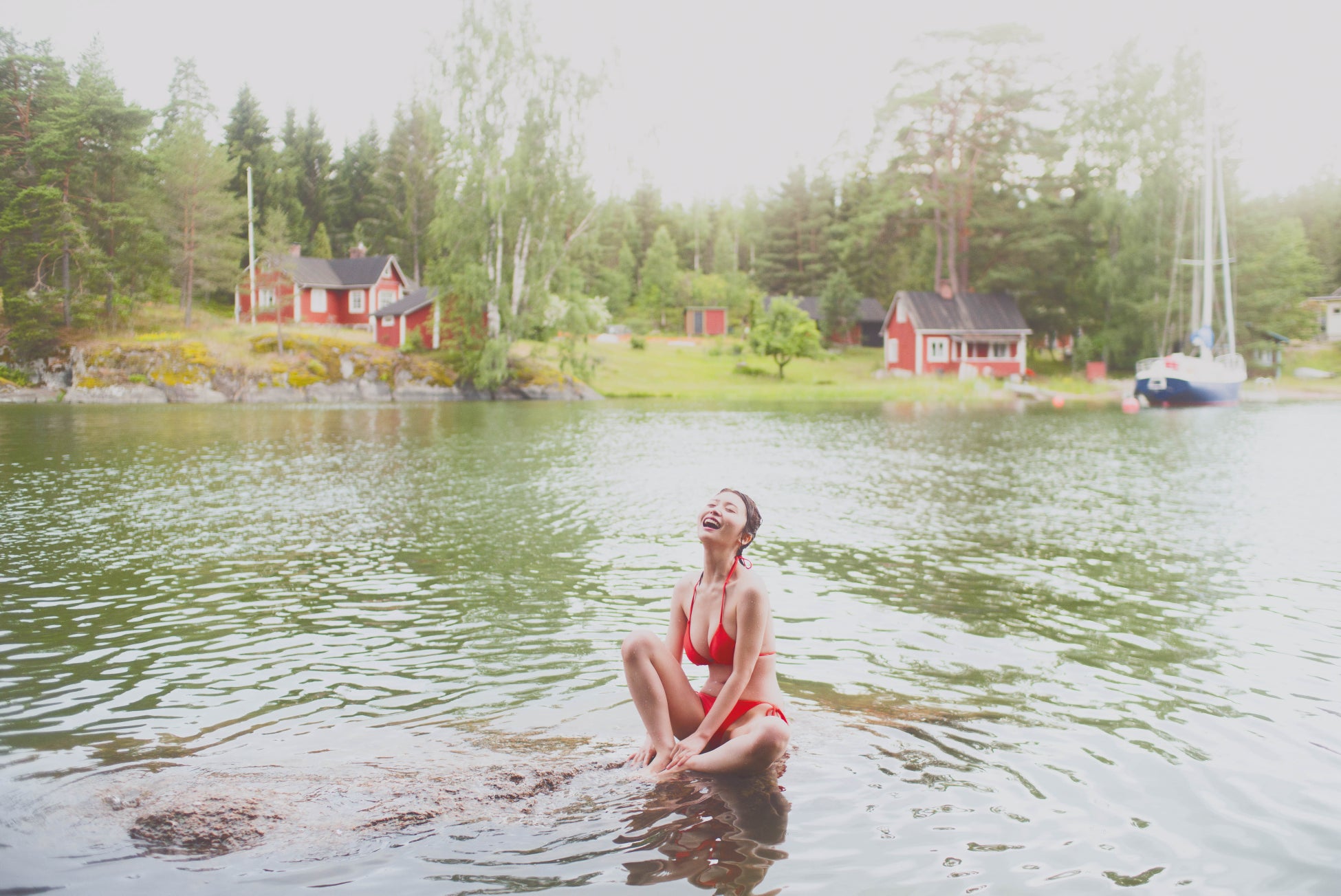 今回解禁するのは、鮮やかなオレンジ色の水着で笑顔を見せる一枚。以前に先行解禁した“水にダイブする前”を捉えたカットの続編ともいえるシーンで、フィンランドの群島地域の水辺でひと泳ぎした後、岩礁に座りくつろぐ姿を切り取ったもの。この後、何度も飛び込んでは泳ぎ、を繰り返し、最後には膝を擦りむきながらも水と戯れ、笑顔が溢れる長濱ねるでした。