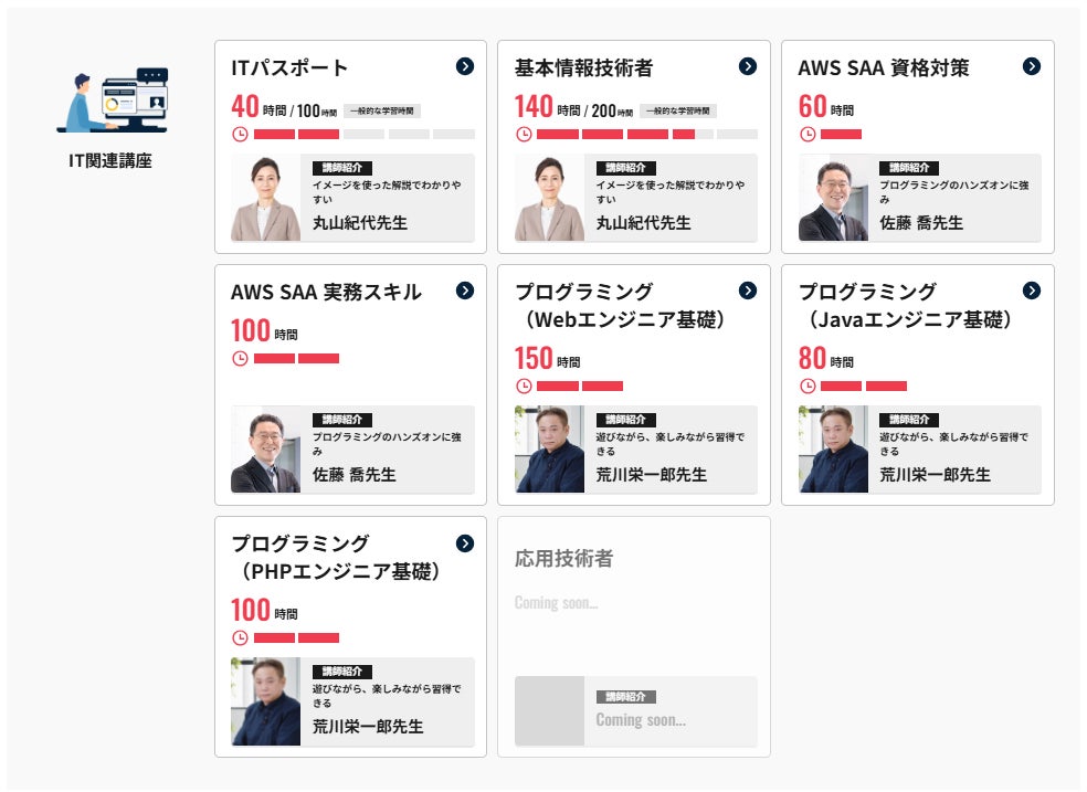 ITパスポート / 基本情報技術者 / AWS SAA 資格対策 / AWS SAA 実務スキル / プログラミング(Webエンジニア基礎) / プログラミング(Javaエンジニア基礎) / プログラミング(PHPエンジニア基礎)