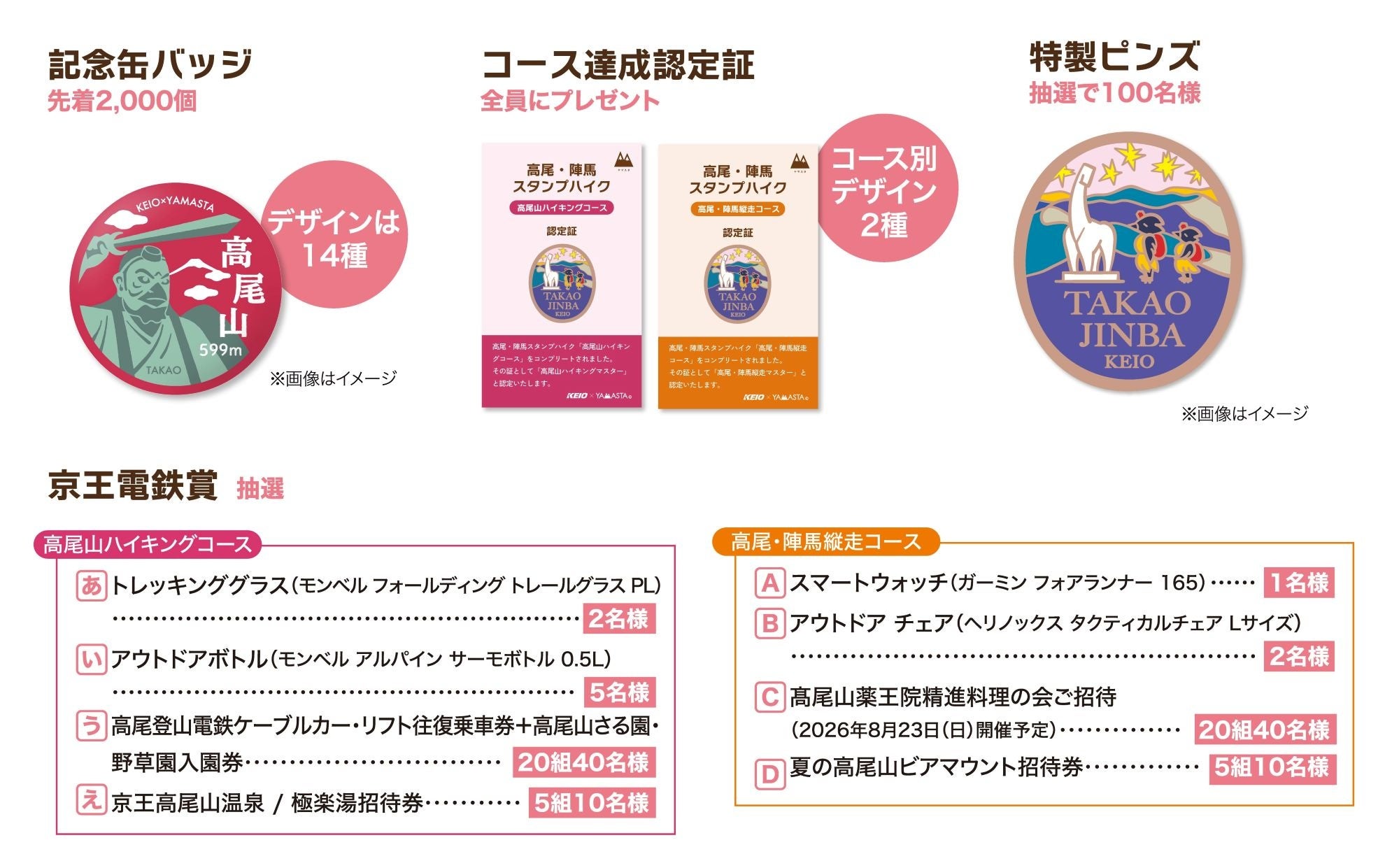 スタンプを集めると、記念缶バッジや達成認定証がもらえるほか、抽選で特製ピンズにご応募いただけます。さらに、京王電鉄賞として、人気アウトドアグッズや高尾山薬王院「精進料理の会」招待券、ビアガーデン「高尾山ビアマウント」招待券などが当たります。