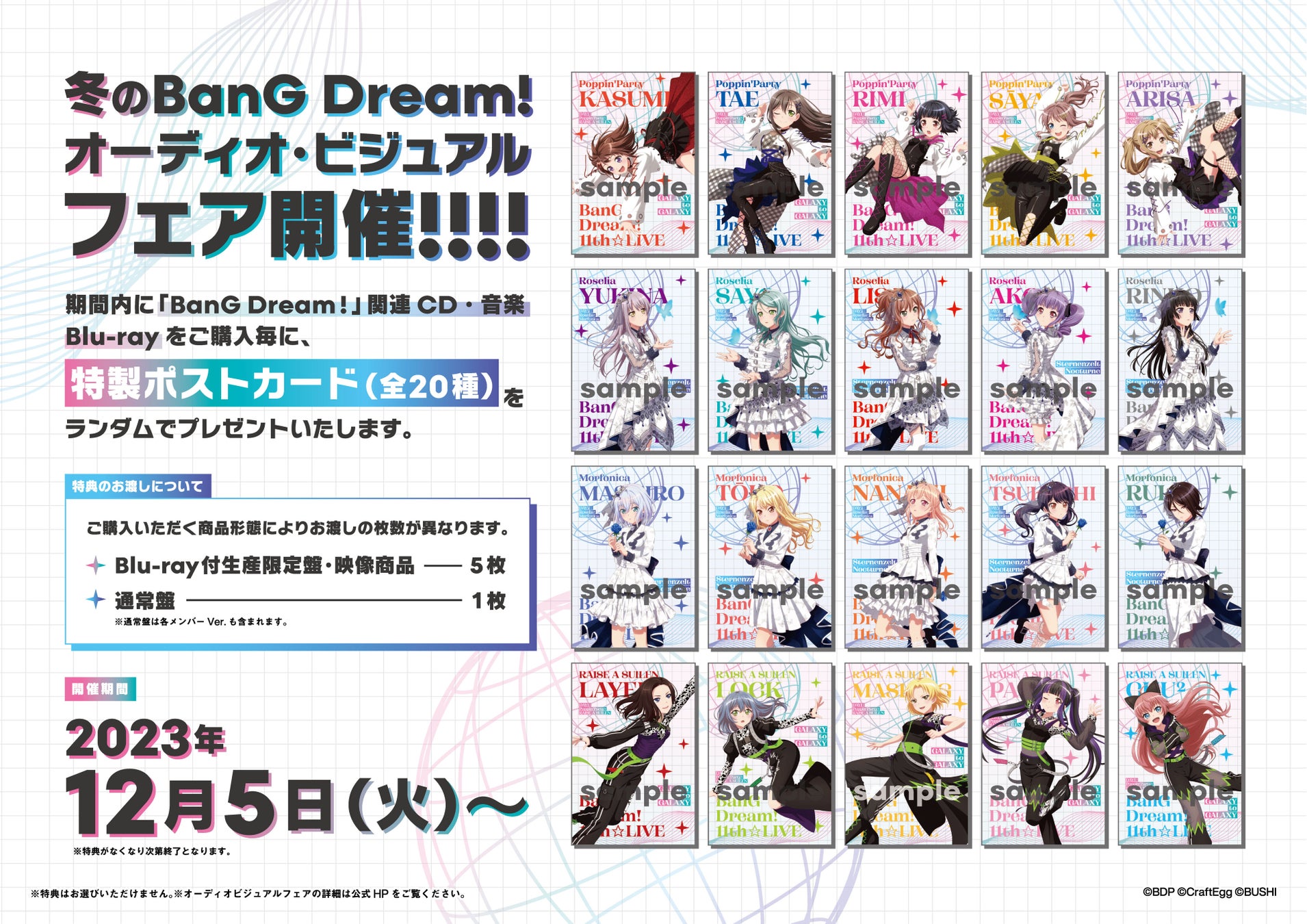 12月5日(火)より、フェア開催対象店舗にて「BanG Dream!」関連CD・音楽Blu-ray(新譜・旧譜含む)をご購入で、「BanG Dream! 11th☆LIVE」キャラ素材を使用した、「特製ポストカード」(全20種)の中からランダムでプレゼントいたします。