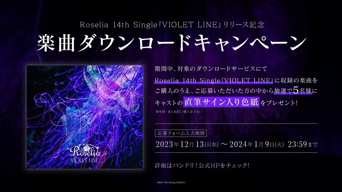 期間中、対象のダウンロードサービスにてRoselia 14th Single「VIOLET LINE」に収録の楽曲をダウンロードしてご応募いただいた方の中から、抽選で5名様にキャストの直筆サイン入り色紙をプレゼント!