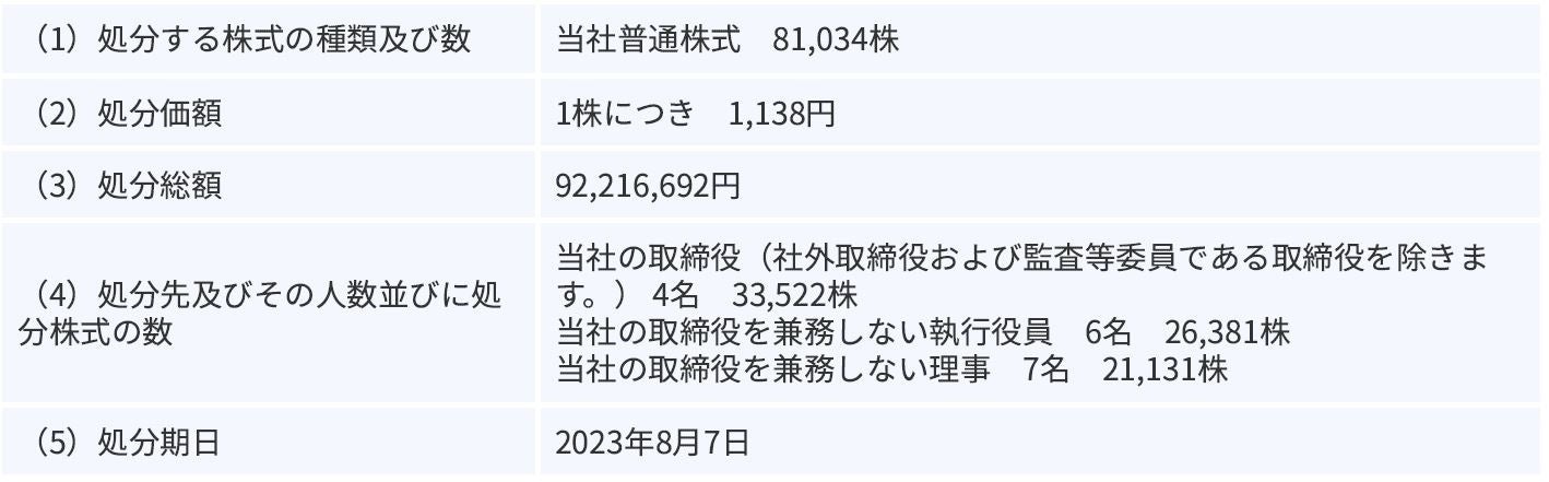 当社は、2023年7月19日開催の取締役会において決議されました、譲渡制限付株式報酬としての自己株式の処分に関し、本日払込手続きが完了いたしましたので、下記のとおりお知らせいたします。本件の詳細につきましては、2023年7月19日付「譲渡制限付株式報酬としての自己株式の処分に関するお知らせ」をご参照ください。
